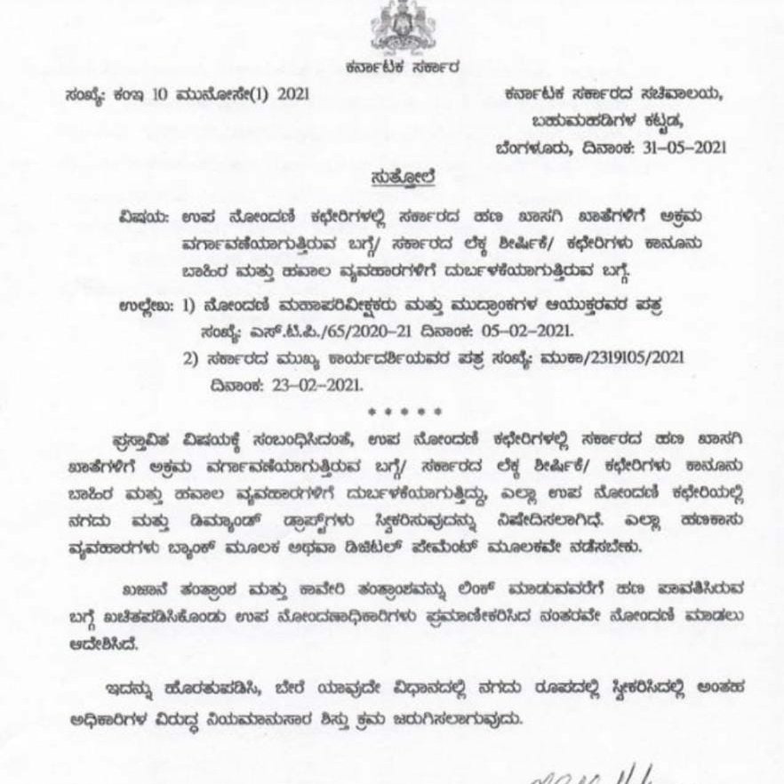 ಈ ಪತ್ರಗಳನ್ನು ಒರೆಗೆ ಹಚ್ಚಿದ್ದ ರಾಜ್ಯ ಸರ್ಕಾರ ಇದೀಗ ಉಪ ನೋಂದಣಿ ಕಚೇರಿಗಳಲ್ಲಿ ಸರ್ಕಾರದ ಹಣವು ಖಾಸಗಿ ಖಾತೆಗಳಿಗೆ ಅಕ್ರಮ ವರ್ಗಾವಣೆ ಆಗುತ್ತಿರುವ ಬಗ್ಗೆ, ಸರ್ಕಾರದ ಲೆಕ್ಕ ಶೀರ್ಷಿಕೆ, ಕಚೇರಿಗಳು ಕಾನೂನುಬಾಹಿರ ಮತ್ತು ಹವಾಲ ವ್ಯವಹಾರಳಿಗೆ ದುರ್ಬಳಕೆಯಾಗುತ್ತಿದ್ದು, ಎಲ್ಲಾ ಉಪ ನೋಂದಣಿ ಕಚೇರಿಯಲ್ಲಿ ನಗದು ಮತ್ತು ಡಿಮ್ಯಾಂಡ್ ಡ್ರಾಫ್ಟ್ಗಳು ಸ್ವೀಕರಿಸುವುದನ್ನು ನಿಷೇಧಿಸಲಾಗಿದೆ. ಎಲ್ಲಾ ಹಣಕಾಸು ವ್ಯವಹಾರಗಳು ಬ್ಯಾಂಕ್ ಮೂಲಕ ಅಥವಾ ಡಿಜಿಟಲ್ ಪೇಮೆಂಟ್ ಮೂಲಕವೇ ನಡೆಸಬೇಕು ಎಂದು 2021ರ ಮೇ 31ರಂದು ಸುತ್ತೋಲೆ ಹೊರಡಿಸಿದೆ.