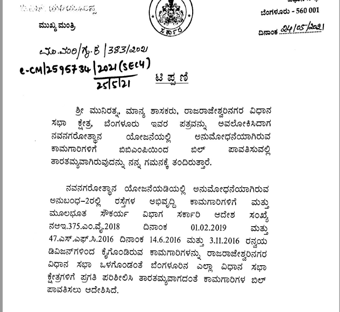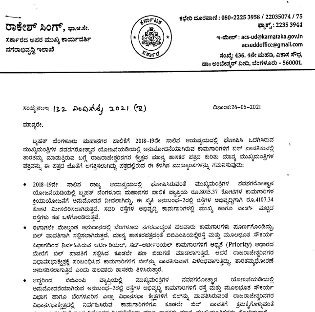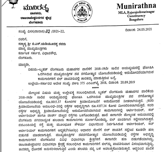 ಮುಖ್ಯಮಂತ್ರಿಗಳ ನವ ನಗರೋತ್ಥಾನ ಯೋಜನೆಯಡಿಯಲ್ಲಿ ರಸ್ತೆಗಳ ಅಭಿವೃದ್ಧಿ ಕಾಮಗಾರಿಗಳಿಗೆ ಬೆಂಗಳೂರಿನ ವಿವಿಧ ವಿಧಾನಸಭೆ ಕ್ಷೇತ್ರಗಳಿಗೆ ಈಗಾಗಲೇ ಅನುದಾದ ಬಿಡುಗಡೆಯಾಗಿದೆ. ರಾಜರಾಜೇಶ್ವರಿ ನಗರ ವಿಧಾನಸಭೆ ಕ್ಷೇತ್ರಕ್ಕೆ ಸಂಬಂಧಿಸಿದ ಕಾಮಗಾರಿಗಳಿಗೆ ಬಿಲ್ನ್ನು ಪಾವತಿಸುವಾಗ ಬಿಬಿಎಂಪಿಯು ವಿಳಂಬ ಮಾಡುತ್ತಿದೆಯಲ್ಲದೇ ತಾರತಮ್ಯ ಧೋರಣೆ ಅನುಸರಿಸಲಾಗುತ್ತಿದೆ ಎಂದು ಶಾಸಕ ಮುನಿರತ್ನ ಅವರು ಅಲವತ್ತುಕೊಂಡಿರುವುದು ಅವರು ಬರೆದಿರುವ ಪತ್ರದಿಂದ ಗೊತ್ತಾಗಿದೆ.