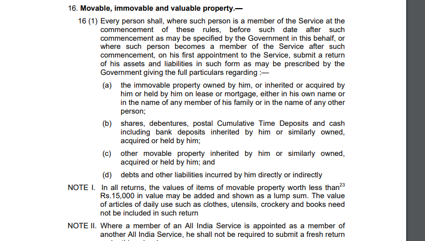 1968ರ ಅಖಿಲ ಭಾರತ ಸೇವೆಗಳ ನಿಯಮದ ಪ್ರಕಾರ ಈ ಮೊದಲಿನಿಂದಲೂ ಚರಾಸ್ತಿಗಳ ವಿವರಗಳ ಪಟ್ಟಿಯನ್ನು ಘೋಷಿಸಬೇಕಿತ್ತು. ತದನಂತರ 2013ರಲ್ಲಿ ಜಾರಿಗೊಂಡ ಲೋಕಪಾಲ್/ಲೋಕಾಯುಕ್ತ ಕಾಯ್ದೆ ಪ್ರಕಾರ ನಿರ್ದಿಷ್ಟವಾದ ಸೂಚನೆಗಳಿದ್ದರೂ ಸಹ ಚರಾಸ್ತಿಗಳ ವಿವರವನ್ನು ಘೋಷಿಸದೆಯೇ ನಿಯಮ ಉಲ್ಲಂಘಿಸುವ ಮೂಲಕ ಭಾರತ ಸರ್ಕಾರದ ಅಧಿಸೂಚನೆಯನ್ನು ಬದಿಗೆ ಸರಿಸಲಾಗಿದೆ. ಉನ್ನತ ಅಧಿಕಾರಿಗಳೇ ಈ ತರಹದ ಉಲ್ಲಂಘನೆ ಮಾಡುತ್ತಿರುವುದರ ಹಿಂದೆ ಅವರು ಮಾಡಿರಬಹುದಾದ ಹೂಡಿಕೆಗಳು, ಷೇರುಗಳ ಖರೀದಿ ಸೇರಿದಂತೆ ಇನ್ನಿತರೆ ವಾಣಿಜ್ಯ/ವ್ಯವಹಾರ ಚಟುವಟಿಕೆಗಳನ್ನು ಮುಚ್ಚಿಟ್ಟಿರುವ ಹಿಂದೆ ವ್ಯಾಪಕ ಭ್ರಷ್ಟಾಚಾರ ನಡೆದಿರುವುದು ಕೂಡ ಬಲವಾದ ಕಾರಣ ಇರಬಹುದು.