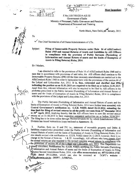 ಭಾರತ ಸರ್ಕಾರವು 2015ರ ಜನವರಿ 23ರಂದು ರಾಜ್ಯ ಸರ್ಕಾರಗಳ ಮುಖ್ಯ ಕಾರ್ಯದರ್ಶಿಗಳಿಗೆ ಬರೆದಿರುವ ಪತ್ರದ ಪ್ರಕಾರ ಅಖಿಲಭಾರತ ಸೇವೆ ಅಧಿಕಾರಿಗಳು ಕೇವಲ ಸ್ಥಿರಾಸ್ತಿಗಳ ವಿವರಗಳನ್ನಷ್ಟೇ ಸಲ್ಲಿಸುವುದಲ್ಲ. ಅದರ ಜತೆಗೆ ಚರಾಸ್ತಿಗಳು ಮತ್ತು ಸಾಲ, ಹೊಣೆಗಾರಿಕೆಯ ವಿವರಗಳನ್ನೂ ಸೇರ್ಪಡೆಗೊಳಿಸಿ ಪರಿಷ್ಕೃತ ವಾರ್ಷಿಕ ಪ್ರಮಾಣ ಪತ್ರವನ್ನು ಸಲ್ಲಿಸಬೇಕು ಎಂದು ಸೂಚಿಸಿ ಪತ್ರ ಬರೆದಿತ್ತು.