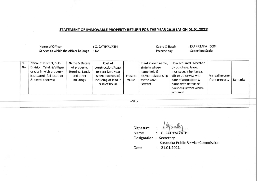 ಕರ್ನಾಟಕ ಶ್ರೇಣಿಯ ಒಟ್ಟು ಐಎಎಸ್ ಅಧಿಕಾರಿಗಳ ಪೈಕಿ 198 ಅಧಿಕಾರಿಗಳು ವಾರ್ಷಿಕ ಸ್ಥಿರಾಸ್ತಿಯನ್ನ ಘೋಷಿಸಿದ್ದಾರೆ. ಈ ಪೈಕಿ 36 ಐಎಎಸ್ ಅಧಿಕಾರಿಗಳು ತಮ್ಮ ಬಳಿ ಸ್ಥಿರಾಸ್ತಿಯೇ ಇಲ್ಲ ಎಂದು ಘೋಷಿಸಿರುವುದು ತಿಳಿದು ಬಂದಿದೆ. ಕರ್ನಾಟಕ ಲೋಕಸೇವಾ ಆಯೋಗ ಕಾರ್ಯದರ್ಶಿ ಜಿ ಸತ್ಯವತಿ ಅವರು ಸಹ ಈ ಪಟ್ಟಿಯಲ್ಲಿದ್ದಾರೆ.