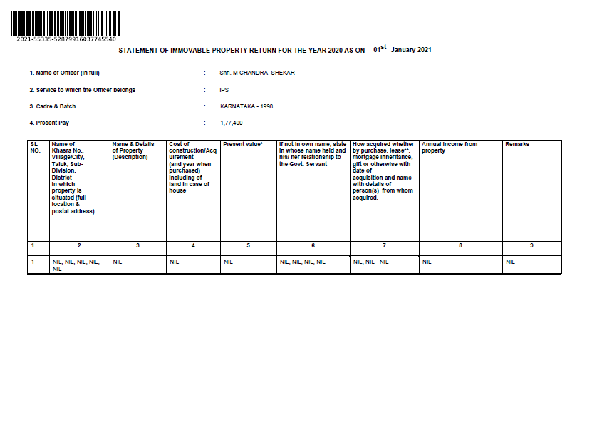 ಕಳೆದ 10 ವರ್ಷಗಳಿಂದಲೂ ಅಖಿಲಭಾರತ ಸೇವೆಯಲ್ಲಿರುವ ಹಲವು ಅಧಿಕಾರಿಗಳೂ ತಮ್ಮ ಬಳಿ ಒಂದೇ ಒಂದು ಸ್ಥಿರಾಸ್ತಿಯೂ ಇಲ್ಲ ಎಂದು ಘೋಷಿಸಿರುವುದು ಪಟ್ಟಿಯಿಂದ ಗೊತ್ತಾಗಿದೆ. ಈ ಪಟ್ಟಿಯಲ್ಲಿ ಐಜಿಪಿ ಚಂದ್ರಶೇಖರ್ ಕೂಡ ಇದ್ದಾರೆ.