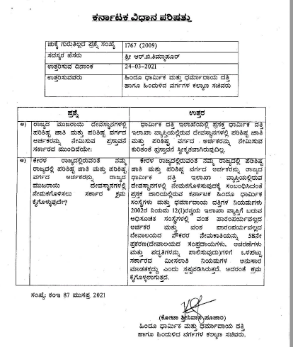 ‘ಕೇರಳ ರಾಜ್ಯದಲ್ಲಿರುವಂತೆ ನಮ್ಮ ರಾಜ್ಯದಲ್ಲಿ ಪರಿಶಿಷ್ಟ ಜಾತಿ ಮತ್ತು ಪರಿಶಿಷ್ಟ ವರ್ಗದ ಅರ್ಚಕರನ್ನು ರಾಜ್ಯದ ಧಾರ್ಮಿಕ ದತ್ತಿ ಇಲಾಖೆ ವ್ಯಾಪ್ತಿಯಲ್ಲಿರುವ ದೇವಸ್ಥಾನಗಳಲ್ಲಿ ನೇಮಕಗೊಳಿಸುವುದಕ್ಕೆ ಸಂಬಂಧಿಸಿದಂತೆ ಪ್ರಸಕ್ತ ಜಾರಿಯಲ್ಲಿರುವ ಕರ್ನಾಟಕ ಹಿಂದೂ ಧಾರ್ಮಿಕ ಸಂಸ್ಥೆಗಳು ಮತ್ತು ಧರ್ಮಾದಾಯ ದತ್ತಿಗಳ ನಿಯಮಗಳು 2002ರ ನಿಯಮ 12(1)ರ ಅನ್ವಯ ಇಲಾಖಾ ವ್ಯಾಪ್ತಿಗೆ ಬರುವ ಅಧಿಸೂಚಿತ ಸಂಸ್ಥೆಗಳಲ್ಲಿ ವಂಶ ಪಾರಂಪರ್ಯವಲ್ಲದ ಅರ್ಚಕರ ಮತ್ತು ವಂಶ ಪಾರಂಪರ್ಯವಲ್ಲದ ದೇವಾಲಯದ ನೌಕರರ ನೇಮಕಾತಿಯನ್ನು 58ನೇ ಪ್ರಕರಣ (ದೇವಾಲಯದ ಸಂಪ್ರದಾಯಗಳು, ಆಚರಣೆಗಳು ಮತ್ತು ಪದ್ಧತಿಗಳನ್ನು ಪಾಲಿಸುವುದು)ಗಳಿಗೆ ಒಳಪಟ್ಟು ಸರ್ಕಾರದ ಮೀಸಲಾತಿ ನಿಯಮಗಳ ಅನುಸಾರ ಮಾಡತಕ್ಕದ್ದು ಎಂದು ಸ್ಪಷ್ಟಪಡಿಸಿರುತ್ತದೆ. ಅದರಂತೆ ಕ್ರಮ ಕೈಗೊಳ್ಳಲಾಗುತ್ತದೆ,’ ಎಂದು ಸರ್ಕಾರ ಉತ್ತರಿಸಿದೆ.