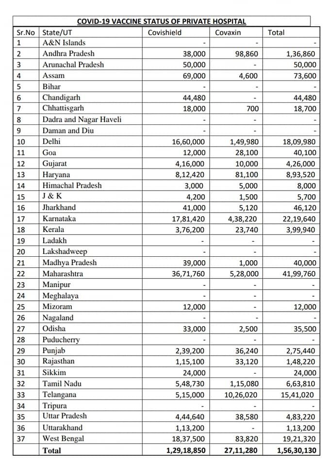 ಆಂಧ್ರ ಪ್ರದೇಶದಲ್ಲಿನ ಖಾಸಗಿ ಆಸ್ಪತ್ರೆಗಳಲ್ಲಿ 1,36,860, ಅರುಣಾಚಲ ಪ್ರದೇಶದಲ್ಲಿ 50,000, ಅಸ್ಸಾಂನಲ್ಲಿ 73,600, ಛತ್ತೀಸ್ಗಡ್ದಲ್ಲಿ 44,480, ಗೋವಾದಲ್ಲಿ 40,100, ಹರ್ಯಾಣದಲ್ಲಿ 8,93,250, ಹಿಮಾಚಲಪ್ರದೇಶದಲ್ಲಿ 8,000, ಜಮ್ಮು ಕಾಶ್ಮೀರದಲ್ಲಿ 5,700, ಜಾರ್ಖಂಡ್ನಲ್ಲಿ 46,120, ಕೇರಳದಲ್ಲಿ 3,99,940, ಮಧ್ಯ ಪ್ರದೇಶದಲ್ಲಿ 40,000, ಮಿಜೋರಾಂ 12,000, ಒಡಿಶಾದಲ್ಲಿ 35,500, ಪಂಜಾಬ್ನಲ್ಲಿ 2,75,440, ರಾಜಸ್ಥಾನದಲ್ಲಿ 1,48,220, ಸಿಕ್ಕೀಂನಲ್ಲಿ 24,000, ತಮಿಳುನಾಡಿನಲ್ಲಿ 6,63,810, ಉತ್ತರ ಪ್ರದೇಶದಲ್ಲಿ 4,83,220, ಉತ್ತರಾಖಂಡ್ನ ಖಾಸಗಿ ಆಸ್ಪತ್ರೆಗಳಲ್ಲಿ 1,13,200 ಕೋವಿಡ್ ಲಸಿಕೆಗಳಿವೆ.