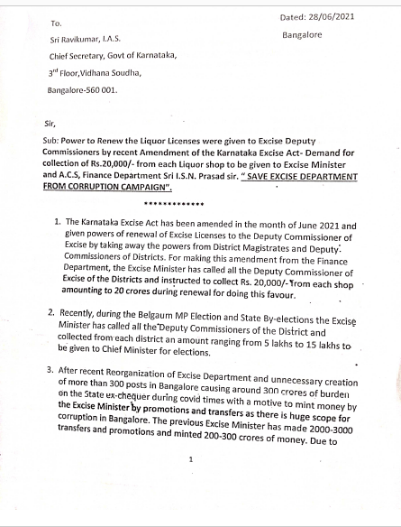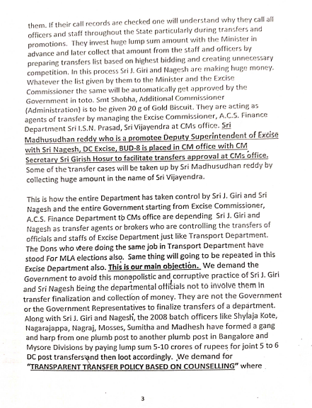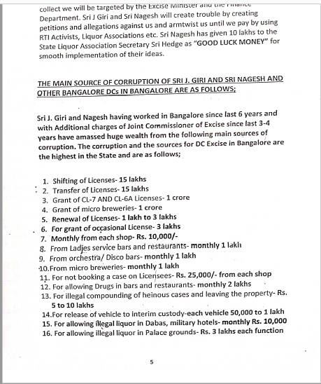 ‘ಬೆಂಗಳೂರು ಮತ್ತು ಮೈಸೂರು ವಿಭಾಗದಲ್ಲಿ ಕಾರ್ಯನಿರ್ವಹಿಸುತ್ತಿರುವ ಜಿಲ್ಲಾ ಮಟ್ಟದ ಅಧಿಕಾರಿಗಳ ವರ್ಗಾವಣೆಗಾಗಿ 5-10 ಕೋಟಿ ರು. ವಸೂಲಿ ಮಾಡಲಾಗುತ್ತಿದೆ. ಹಣ ಕೊಟ್ಟವರನ್ನು ವರ್ಗಾವಣೆ ಮಾಡಲಾಗುತ್ತಿದೆ. ಮದ್ಯದ ಅಂಗಡಿಗಳ ಪರವಾನಿಗೆ ನವೀಕರಣ ಮತ್ತು ಹೊಸದಾಗಿ ಪರವಾನಿಗೆ ನೀಡಲಾಗುತ್ತಿದೆ. ಜೆ ಗಿರಿ ಎಂಬ ಅಧಿಕಾರಿಯ ಮಾತನ್ನು ಆರ್ಥಿಕ ಇಲಾಖೆಯ ಸರ್ಕಾರದ ಹೆಚ್ಚುವರಿ ಮುಖ್ಯ ಕಾರ್ಯದರ್ಶಿ ಐಎಸ್‌ಎನ್ ಪ್ರಸಾದ್‌ ಅವರು ಕೇಳುತ್ತಿದ್ದಾರೆ. ಒಂದೊಂದು ಲಿಕ್ಕರ್‌ ಮಳಿಗೆಯಿಂದ 20,000 ರು.ದಂತೆ ಅಂದಾಜು 20 ಕೋಟಿ ರು.ಗಳನ್ನು ಅಬಕಾರಿ ಸಚಿವರ ಹೆಸರಿನಲ್ಲಿ ಸಂಗ್ರಹಿಸಲಾಗಿದೆ. ಇದರಲ್ಲಿ 10 ಕೋಟಿ ಜೆ ಗಿರಿ ಮತ್ತು ನಾಗೇಶ್‌ ಎಂಬುವರು ಹಂಚಿಕೊಂಡಿದ್ದಾರೆ,’ ಎಂದು ವಿವರಿಸಲಾಗಿದೆ.