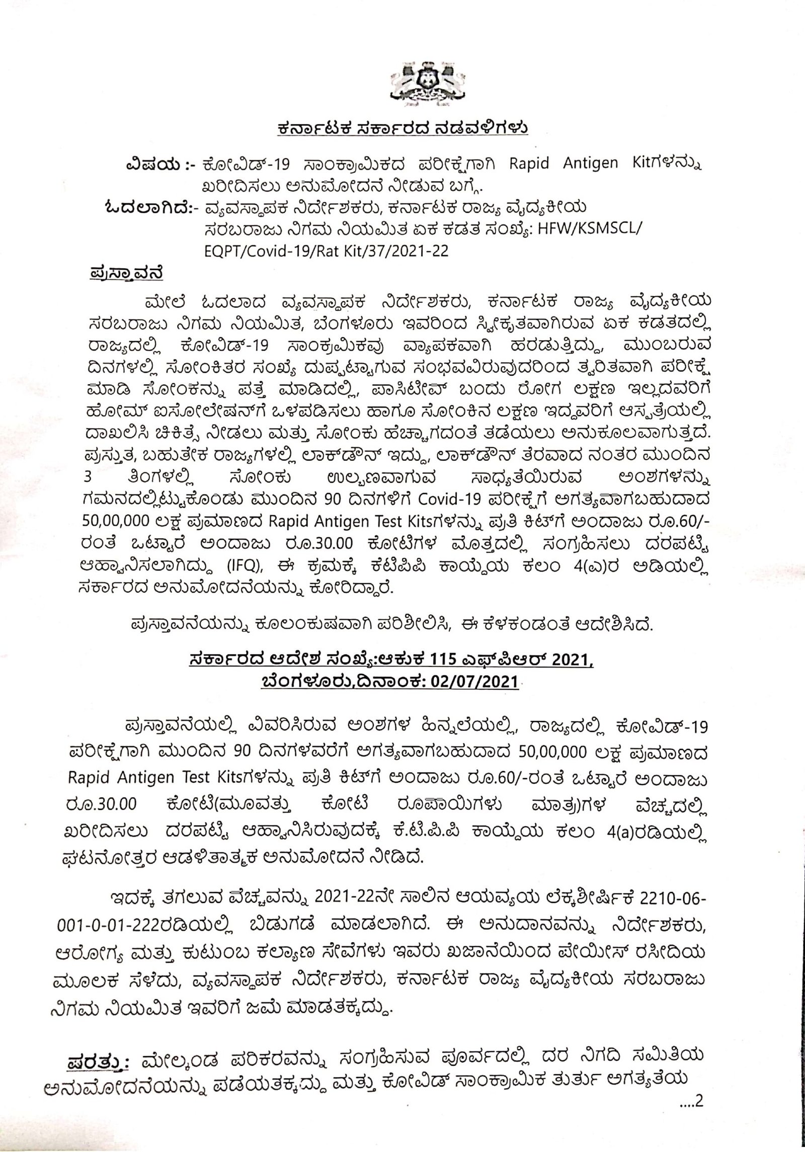 ರ್ಯಾಪಿಡ್ ಆ್ಯಂಟಿಜನ್ ಟೆಸ್ಟ್ (RAT) ಕಿಟ್ ಪರಿಕರಗಳ ಖರೀದಿ ಪ್ರಕ್ರಿಯೆಯಲ್ಲಿ ಕರ್ನಾಟಕ ವೈದ್ಯಕೀಯ ಸರಬರಾಜು ಅಧಿಕಾರಿಗಳು ಎಸಗಿರುವ ವಿಳಂಬ ದ್ರೋಹದಿಂದಾಗಿ ಬೊಕ್ಕಸಕ್ಕೆ 14.75 ಕೋಟಿ ರು. ಹೆಚ್ಚುವರಿ ಹೊರೆಯಾಗಿದೆ. ಈ ಹೊರೆಯನ್ನು ತಪ್ಪಿಸಲು ಎಲ್ಲಾ ರೀತಿಯ ಅವಕಾಶಗಳಿದ್ದರೂ ನಿಗಮದ ಅಧಿಕಾರಿಗಳ ಕಮಿಷನ್ ವ್ಯವಹಾರವೇ ಮೇಲುಗೈಯಾಗಿದ್ದರಿಂದ ಬೊಕ್ಕಸಕ್ಕೆ 14.75 ಕೋಟಿ ನಷ್ಟ ಭರಿಸಬೇಕಾಗಿದೆ.