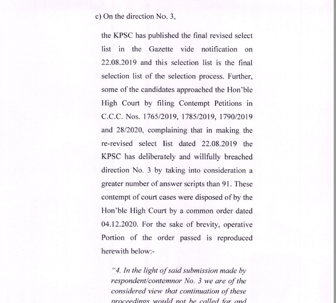 ಈ ಹಿನ್ನೆಲೆಯಲ್ಲಿ ಹೊಸ ಪಟ್ಟಿಯನ್ನು ತಯಾರಿಸಬೇಕು ಎಂದು ನ್ಯಾಯಾಲಯವು 2020ರ ಡಿಸೆಂಬರ್‌ 4ರಂದು ಕೆಪಿಎಸ್‌ಸಿಗೆ ಆದೇಶಿಸಿದೆ ಎಂದು ಆಕ್ಷೇಪಣೆ ಅರ್ಜಿಯಲ್ಲಿ ತಿಳಿಸಿರುವ ರಾಜ್ಯ ಸರ್ಕಾರವು 2021ರ ಜನವರಿ 30ರಂದು ಪರಿಷ್ಕೃತ ಪಟ್ಟಿಯನ್ನು ಕೆಪಿಎಸ್‌ಸಿ ಪ್ರಕಟಿಸಿದೆ. ಇದೇ ಪಟ್ಟಿಯನ್ನು2021ರ ಫೆ.5ರಂದು ಸರ್ಕಾರಕ್ಕೆ ಕಳಿಸಿದೆ ಎಂದು ಆಕ್ಷೇಪಣೆಯಲ್ಲಿ ಹೇಳಲಾಗಿದೆ.