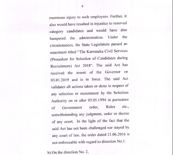 6ನೇ ನಿರ್ದೇಶನದ ಪ್ರಕಾರ ಬಾಧಿತ ಅಭ್ಯರ್ಥಿಗಳಿಗೆ ಕರ್ನಾಟಕ ಆಡಳಿತ ನ್ಯಾಯಮಂಡಳಿ ಮೂಲಕ ಇತ್ಯರ್ಥಪಡಿಸಿಕೊಳ್ಳಲು ಆದೇಶಿಸಿದೆ. ಅದರಂತೆ ಆಯ್ಕೆಗೊಂಡ ಅನೇಕ ಅಭ್ಯರ್ಥಿಗಳು ಈಗಾಗಲೇ ಕೆಎಟಿಯಲ್ಲಿ ಅರ್ಜಿ ದಾಖಲಿಸಿ ಪರಿಹಾರ ಪಡೆದುಕೊಳ್ಳಲು ಮುಂದಾಗಿರುತ್ತಾರೆ ಎಂದು ತಿಳಿಸಿದೆ.