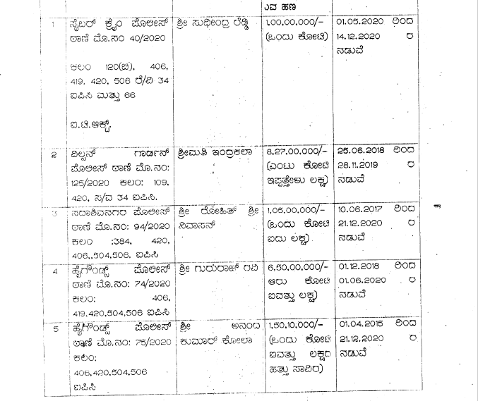 ಸುದೀಂಧ್ರ ರೆಡ್ಡಿ ಎಂಬುವರಿಗೆ (ಸೈಬರ್ ಕ್ರೈಂ ಪೊಲೀಸ್ ಠಾಣೆ ಮೊಕದ್ದಮೆ ಸಂಖ್ಯೆ 40/2020) 1 ಕೋಟಿ, ಇಂದ್ರಕಲಾ ಅವರಿಗೆ 8.27 ಕೋಟಿ, ರೋಹಿತ್ ಶ್ರೀನಿವಾಸನ್ 1.50 ಕೋಟಿ, ಗುರುರಾಜ್ ರವಿ ಎಂಬುವರಿಗೆ 6.50 ಕೋಟಿ ರು. ಆನಂದ್ಕುಮಾರ್ ಕೋಲಾ ಎಂಬುವರಿಗೆ 1.50 ಕೋಟಿ ರು. ವಂಚನೆ ಮಾಡಿರುವುದು ದೋಷಾರೋಪಣೆ ಪಟ್ಟಿಯಿಂದ ಗೊತ್ತಾಗಿದೆ.