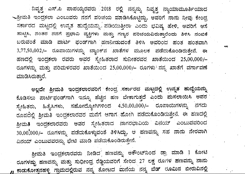 ಅಲ್ಲದೆ ಇಂದ್ರಕಲಾ ಅವರ ಸ್ನೇಹಿತರು, ಹಿತೈಷಿಗಳು ಮತ್ತು ಸಹದ್ಯೋಗಿಗಳಿಂದ 4,50,00,000 ರು.ಗಳನ್ನು ನಗದು ರೂಪದಲ್ಲಿ ಪಡೆದಿದ್ದನಲ್ಲದೆ ಅವರ ಸ್ನೇಹಿತರಾಗಿದ್ದ ನಾಗರಬಾವಿಯ ವಿನಯ್ ಎಂಬುವರಿಂದಲೂ 30,00,000 ರು.ಗಳನ್ನು ಪಡೆದಿದ್ದ ಎಂಬುದು ದೋಷಾರೋಪಣೆ ಪಟ್ಟಿಯಿಂದ ತಿಳಿದು ಬಂದಿದೆ.