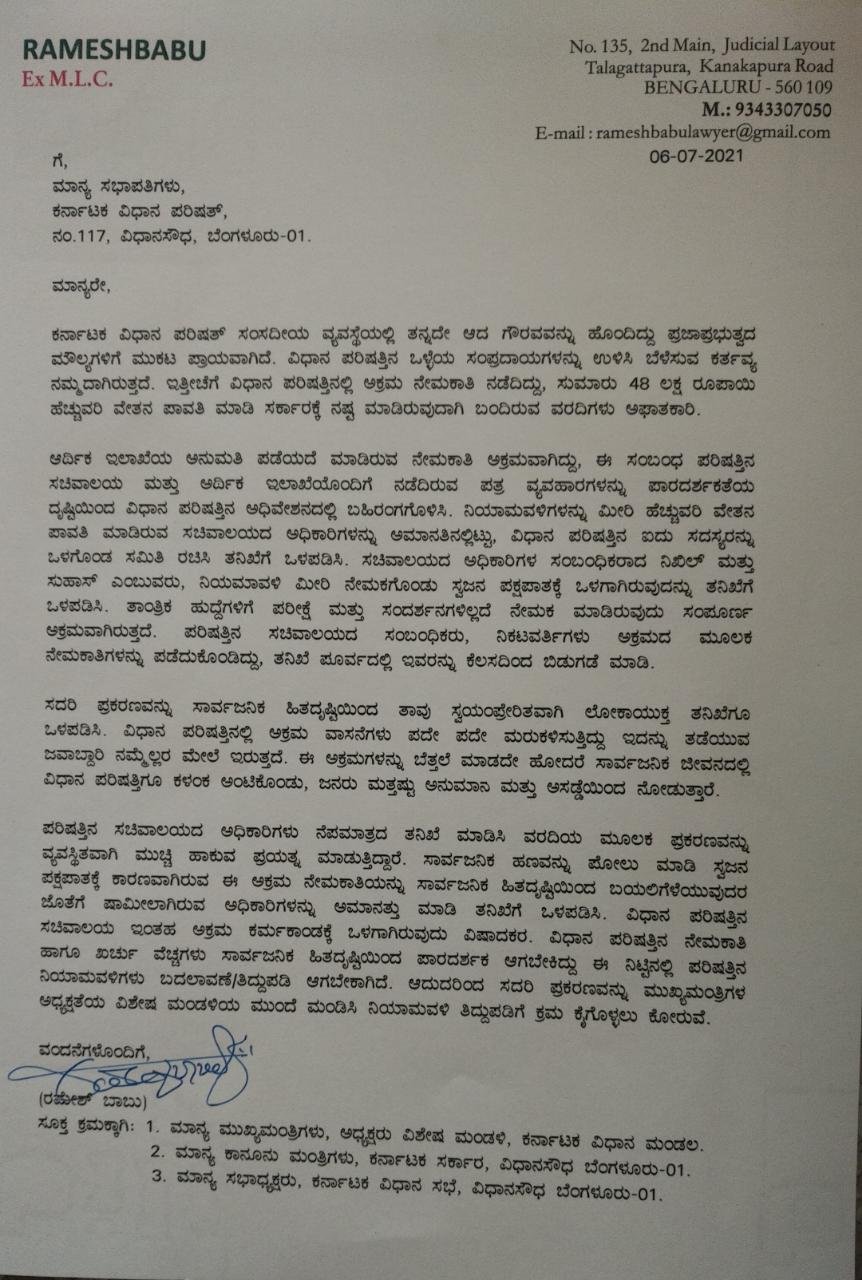 ಸಾರ್ವಜನಿಕ ಹಣವನ್ನು ಪೋಲು ಮಾಡಿ ಸ್ವಜನಪಕ್ಷಪಾತಕ್ಕೆ ಕಾರಣವಾಗಿರುವ ಅಕ್ರಮ ನೇಮಕಾತಿಯನ್ನು ಸಾರ್ವಜನಿಕ ಹಿತದೃಷ್ಟಿಯಿಂದ ಬಯಲಿಗೆಳೆಯುವುದರ ಜೊತೆಗೆ ಶಾಮೀಲಾಗಿರುವ ಅಧಿಕಾರಿಗಳನ್ನೂ ಅಮಾನತುಗೊಳಿಸಬೇಕು. ಹಾಗೆಯೇ ವಿಧಾನಪರಿಷತ್‌ನ ನೇಮಕಾತಿ ಹಾಗೂ ಖರ್ಚು ವೆಚ್ಚಗಳನ್ನು ಪಾರದರ್ಶಕತೆಯಿಂದ ಇಡಬೇಕು. ಈ ನಿಟ್ಟಿನಲ್ಲಿ ನಿಯಮಾವಳಿಗಳ ಬದಲಾವಣೆ/ತಿದ್ದುಪಡಿ ಆಗಬೇಕು. ಹೀಗಾಗಿ ಈ ಪ್ರಕರಣವನ್ನು ಮುಖ್ಯಮಂತ್ರಿಗಳ ಅಧ್ಯಕ್ಷತೆಯ ವಿಶೇಷ ಮಂಡಳಿ ಮುಂದೆ ಮಂಡಿಸಿ ತಿದ್ದುಪಡಿಗೆ ಕ್ರಮ ಕೈಗೊಳ್ಳಬೇಕು,’ ಎಂದು ಒತ್ತಾಯಿಸಿರುವುದು ಪತ್ರದಿಂದ ತಿಳಿದು ಬಂದಿದೆ.