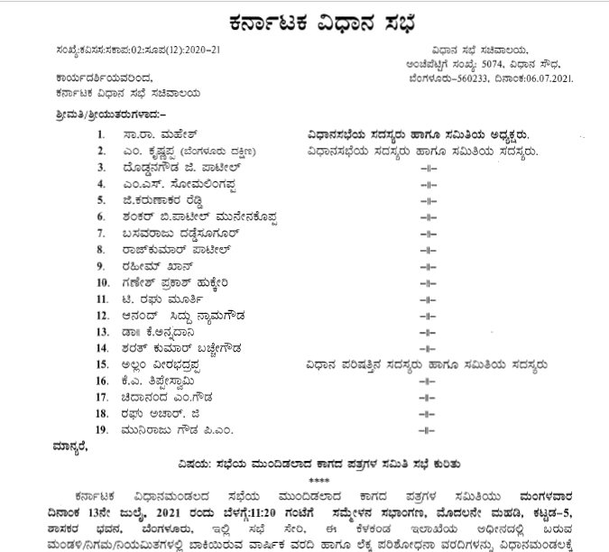 ಜುಲೈ 13ರಂದು ನಡೆಯಲಿರುವ ಸಭೆಯ ಮುಂದಿಡಲಾದ ಕಾಗದ ಪತ್ರಗಳ ಸಮಿತಿ ನಡೆಸುವ ಸಭೆಗೆ ಮೈಸೂರು ಜಿಲ್ಲೆಯ ನಿರ್ಮಿತಿ ಕೇಂದ್ರದ ಪ್ರಗತಿ ವಿವರಗಳೊಂದಿಗೆ ಹಾಜರಾಗಬೇಕು ಎಂದು ಸಮಿತಿಯು ಮೈಸೂರು ಜಿಲ್ಲಾಧಿಕಾರಿಗೆ ಪತ್ರವನ್ನು ಬರೆದಿದೆ ಎಂದು ತಿಳಿದು ಬಂದಿದೆ.