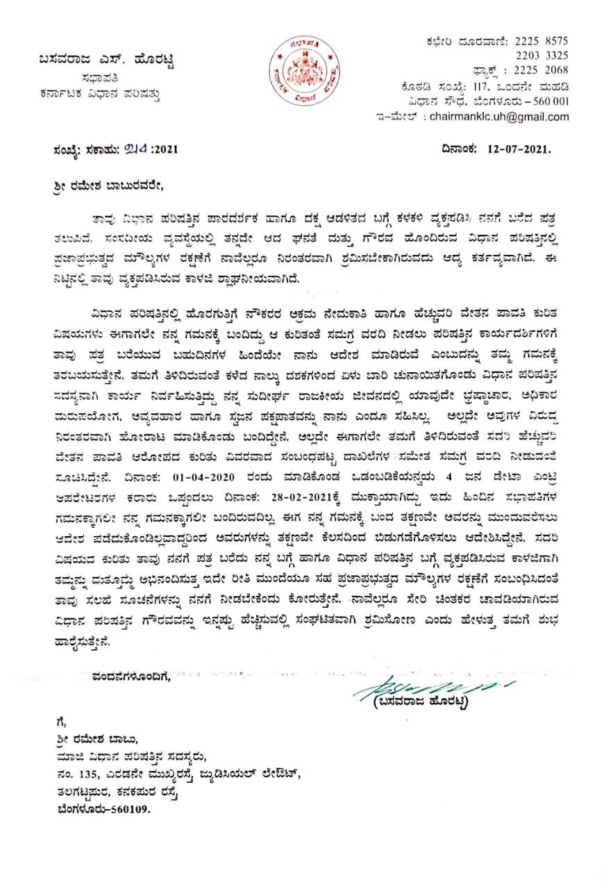 ಪ್ರಕರಣದ ಕುರಿತು ‘ದಿ ಫೈಲ್‌’ ವರದಿ ಆಧರಿಸಿ ವಿಧಾನಪರಿಷತ್‌ ಮಾಜಿ ಸದಸ್ಯ ರಮೇಶ್‌ಬಾಬು ಅವರು ಸಭಾಪತಿ ಅವರಿಗೆ ಇತ್ತೀಚೆಗಷ್ಟೇ ಪತ್ರ ಬರೆದಿದ್ದರು. ಈ ಪತ್ರಕ್ಕೆ ಉತ್ತರಿಸಿರುವ ಸಭಾಪತಿ ಹೊರಟ್ಟಿ ಅವರು ಹೊರಗುತ್ತಿಗೆ ನೌಕರರ ಅಕ್ರಮ ನೇಮಕಾತಿ ಹಾಗೂ ಹೆಚ್ಚುವರಿ ವೇತನ ಪಾವತಿ ಕುರಿತಂತೆ ಸಮಗ್ರ ವರದಿ ಸಲ್ಲಿಸುವಂತೆ ಕಾರ್ಯದರ್ಶಿಗೆ ಪತ್ರ ಬರೆಯಲಾಗಿದೆ ಎಂದು ರಮೇಶ್‌ ಬಾಬು ಅವರಿಗೆ 2021ರ ಜುಲೈ 12ರಂದು ಪತ್ರ ಮುಖೇನ ಉತ್ತರಿಸಿದ್ದಾರೆ.