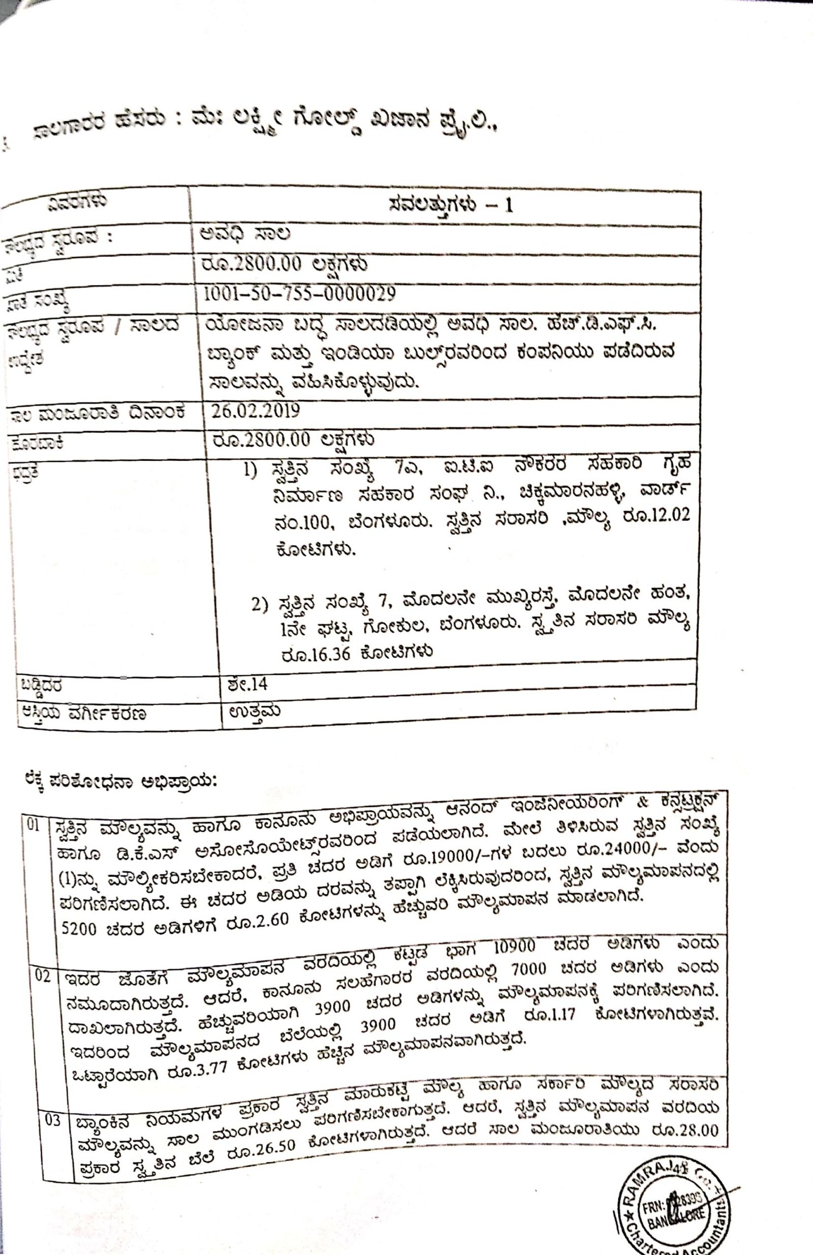 ಸ್ವತ್ತಿನ ಮೌಲ್ಯ ಹಾಗೂ ಕಾನೂನು ಅಭಿಪ್ರಾಯ ನೀಡಿರುವ ಆನಂದ್‌ ಇಂಜಿನಿಯರಿಂಗ್‌ ಮತ್ತು ಕನ್ಸ್‌ಟ್ರಕ್ಷನ್ಸ್‌ ಮತ್ತು ಡಿ ಕೆ ಅಸೋಸಿಯೇಟ್ಸ್‌ ಸ್ವತ್ತನ್ನು ಹೆಚ್ಚುವರಿಯಾಗಿ ಮೌಲ್ಯೀಕರಿಸಲಾಗಿದೆ. ಪ್ರತಿ ಚದರ ಅಡಿಗೆ 19,000 ರು. ಬದಲಿಗೆ 24,000ರು. ಎಂದು ಪರಿಗಣಿಸಿದೆ. ಚದರ ಅಡಿ ದರವನ್ನು ತಪ್ಪಾಗಿ ಲೆಕ್ಕ ಹಾಕಿರುವುದರಿಂದ ಸ್ವತ್ತಿನ ಮೌಲ್ಯಮಾಪನದಲ್ಲಿ 5,200 ಚದರ ಅಡಿಗಳಿಗೆ 2.60 ಕೋಟಿ ಹೆಚ್ಚುವರಿ ಮೌಲ್ಯಮಾಪನ ಮಾಡಿರುವುದನ್ನು ಲೆಕ್ಕ ಪರಿಶೋಧನೆ ವರದಿಯು ಬಹಿರಂಗಗೊಳಿಸಿದೆ.