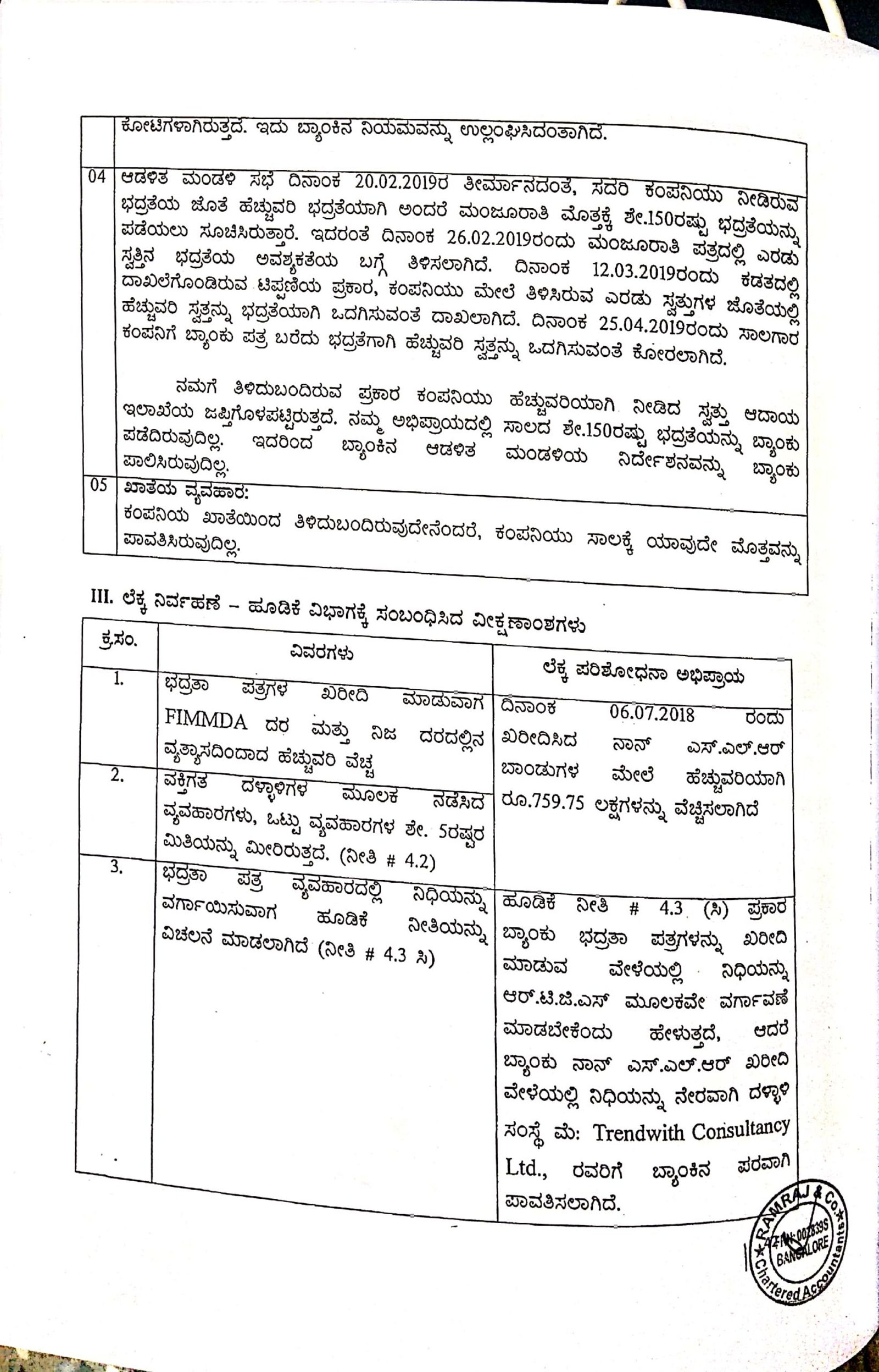 ಕಂಪನಿಯು ಹೆಚ್ಚುವರಿಯಾಗಿ ನೀಡಿರುವ ಸ್ವತ್ತು ಆದಾಯ ಇಲಾಖೆಯ ಜಫ್ತಿಗೊಳಪಟ್ಟಿರುತ್ತದೆ. ಇದು ಸಾಲದ ಶೇ.150ರಷ್ಟು ಭದ್ರತೆಯನ್ನು ಬ್ಯಾಂಕ್‌ ಪಡೆದಿರುವುದಿಲ್ಲ. ಹೀಗಾಗಿ ಬ್ಯಾಂಕ್‌ನ ಆಡಳಿತ ಮಂಡಳಿಯ ನಿರ್ದೆಶನವನ್ನು ಬ್ಯಾಂಕ್‌ ಪಾಲಿಸಿಲ್ಲ. ಅಲ್ಲದೆ ಕಂಪನಿಯು ಸಾಲಕ್ಕೆ ಯಾವುದೇ ಮೊತ್ತವನ್ನೂ ಪಾವತಿಸಿಲ್ಲ ಎಂಬುದು ಲೆಕ್ಕ ಪರಿಶೋಧನೆ ವರದಿಯಿಂದ ಗೊತ್ತಾಗಿದೆ.