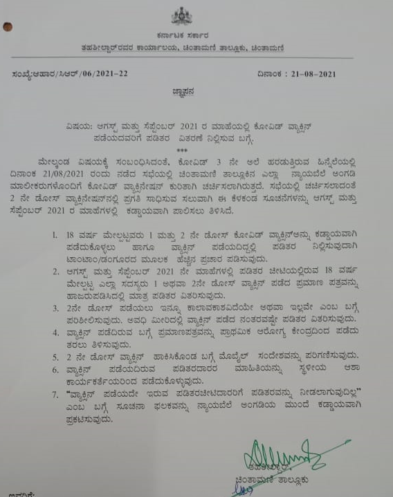 ಕೋವಿಡ್ 3ನೇ ಅಲೆ ಹರಡುತ್ತಿರುವ ಹಿನ್ನೆಲೆಯಲ್ಲಿ 2021ರ ಆಗಸ್ಟ್ 21ರಂದು ಚಿಂತಾಮಣಿಯಲ್ಲಿ ಸಭೆ ನಡೆದಿತ್ತು. ಈ ಸಭೆಯಲ್ಲಿ ಎಲ್ಲಾ ನ್ಯಾಯಬೆಲೆ ಅಂಗಡಿಗಳ ಮಾಲೀಕರೊಂದಿಗೆ ಕೋವಿಡ್ ಲಸಿಕೆ ಕುರಿತು ಚರ್ಚಿಸಲಾಗಿತ್ತು. ಲಸಿಕೆ ಸಂಬಂಧ ಪ್ರಗತಿ ಸಾಧಿಸುವ ಸಲುವಾಗಿ ಆಗಸ್ಟ್ ಮತ್ತು ಸೆಪ್ಟಂಬರ್ನಲ್ಲಿ ಕೆಲವು ಸೂಚನೆಗಳನ್ನು ಕಡ್ಡಾಯವಾಗಿ ಪಾಲಿಸಲು ಸೂಚಿಸಲಾಗಿತ್ತು. ಅದರಲ್ಲಿ ಲಸಿಕೆ ಪಡೆಯದೇ ಇರುವ ಪಡಿತರಚೀಟಿದಾರರಿಗೆ ಪಡಿತರವನ್ನು ನೀಡುವುದಿಲ್ಲ ಎಂಬ ಸೂಚನೆಯನ್ನೂ ನೀಡಲಾಗಿತ್ತು ಎಂಬುದು ಜ್ಞಾಪನ ಪತ್ರದಿಂದ ತಿಳಿದು ಬಂದಿದೆ.
