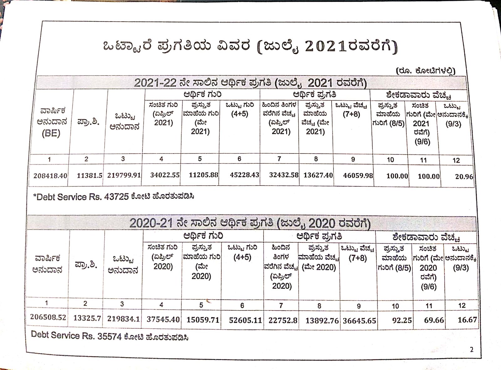 2020-21ನೇ ಸಾಲಿನ ಜುಲೈ ಅಂತ್ಯಕ್ಕೆ ಒಟ್ಟು ಅನುದಾನಕ್ಕೆ ಎದುರಾಗಿ ಶೇಕಡ 16.67 ವೆಚ್ಚ ಮಾಡಿದ್ದರೆ 2021ರ ಜುಲೈ ಅಂತ್ಯಕ್ಕೆ ಶೇ. 20.96ರಷ್ಟು ಮಾತ್ರ ವೆಚ್ಚ ಮಾಡಿದೆ. ಈ ಎರಡೂ ಸಾಲಿಗೆ ಸಂಬಂಧಿಸಿದಂತೆ ಜುಲೈ ಅಂತ್ಯದಲ್ಲಿ ಮಾಡಿರುವ ಒಟ್ಟಾರೆ ವೆಚ್ಚದಲ್ಲಿ ಕೇವಲ ಶೇ.4ರಷ್ಟು ಮಾತ್ರ ಏರಿಕೆ ಕಂಡಿರುವುದು ಪ್ರಗತಿ ವಿವರದಿಂದ ತಿಳಿದು ಬಂದಿದೆ.
