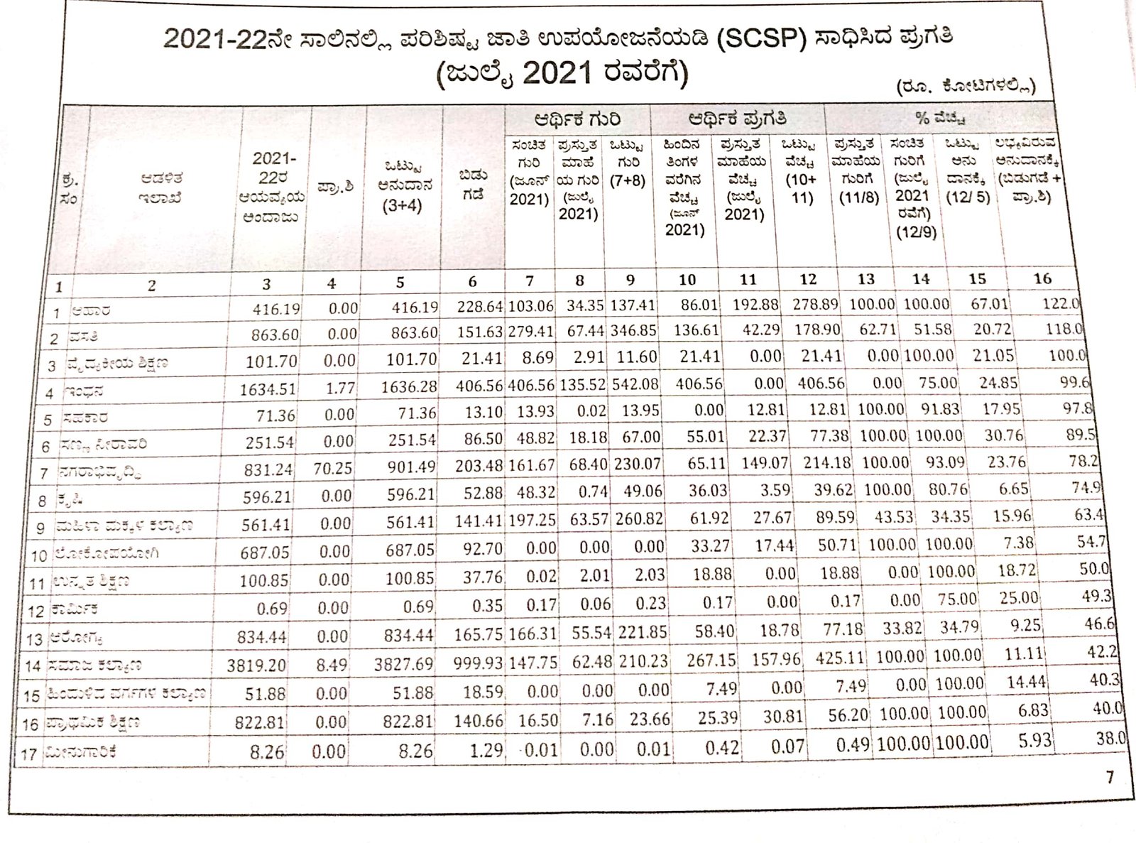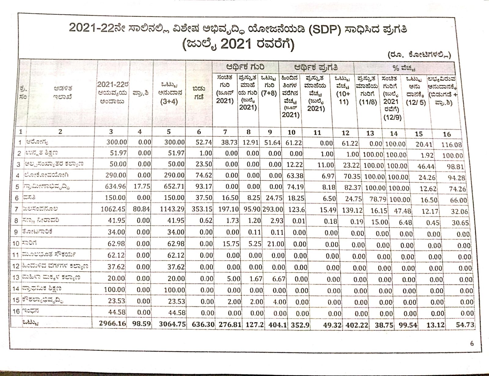 ವಿಶೇಷ ಅಭಿವೃದ್ಧಿ ಯೋಜನೆಯಡಿ ಒಟ್ಟು 16 ಇಲಾಖೆಗಳಿಗೆ 2021-22ರ ಆಯವ್ಯಯದಲ್ಲಿ 2,966.16 ಕೋಟಿ ಮತ್ತು ಪ್ರಾಥಮಿಕ ಶಿಲ್ಕು 98.59 ಕೋಟಿ ಸೇರಿ ಒಟ್ಟು 3,064.75 ಕೋಟಿ ರು. ಅನುದಾನ ಲಭ್ಯವಿತ್ತು. ಜೂನ್‌ ಮತ್ತು ಜುಲೈ ತಿಂಗಳಿಗೆ ಒಟ್ಟು 404.1 ಕೋಟಿ ರು. ಆರ್ಥಿಕ ಗುರಿ ನಿಗದಿಪಡಿಸಿತ್ತು. ಜೂನ್‌ ಮತ್ತು ಜುಲೈ ತಿಂಗಳಲ್ಲಿ ಒಟ್ಟು 402.22 ಕೋಟಿ ರು. ವೆಚ್ಚ ಮಾಡಿದೆ. ಇದು ಒಟ್ಟು ಅನುದಾನಕ್ಕೆ ಎದುರಾಗಿ ಶೇ.13.12ರಷ್ಟೇ ಪ್ರಗತಿ ಸಾಧಿಸಿದಂತಾಗಿದೆ. ಲಭ್ಯವಿರುವ ಅನುದಾನಕ್ಕೆ (ಬಿಡುಗಡೆ ಮತ್ತು ಪ್ರಾಥಮಿಕ ಶಿಲ್ಕು) ಶೇ. 54.73ರಷ್ಟು ಪ್ರಗತಿ ಸಾಧಿಸಿರುವುದು ಗೊತ್ತಾಗಿದೆ.