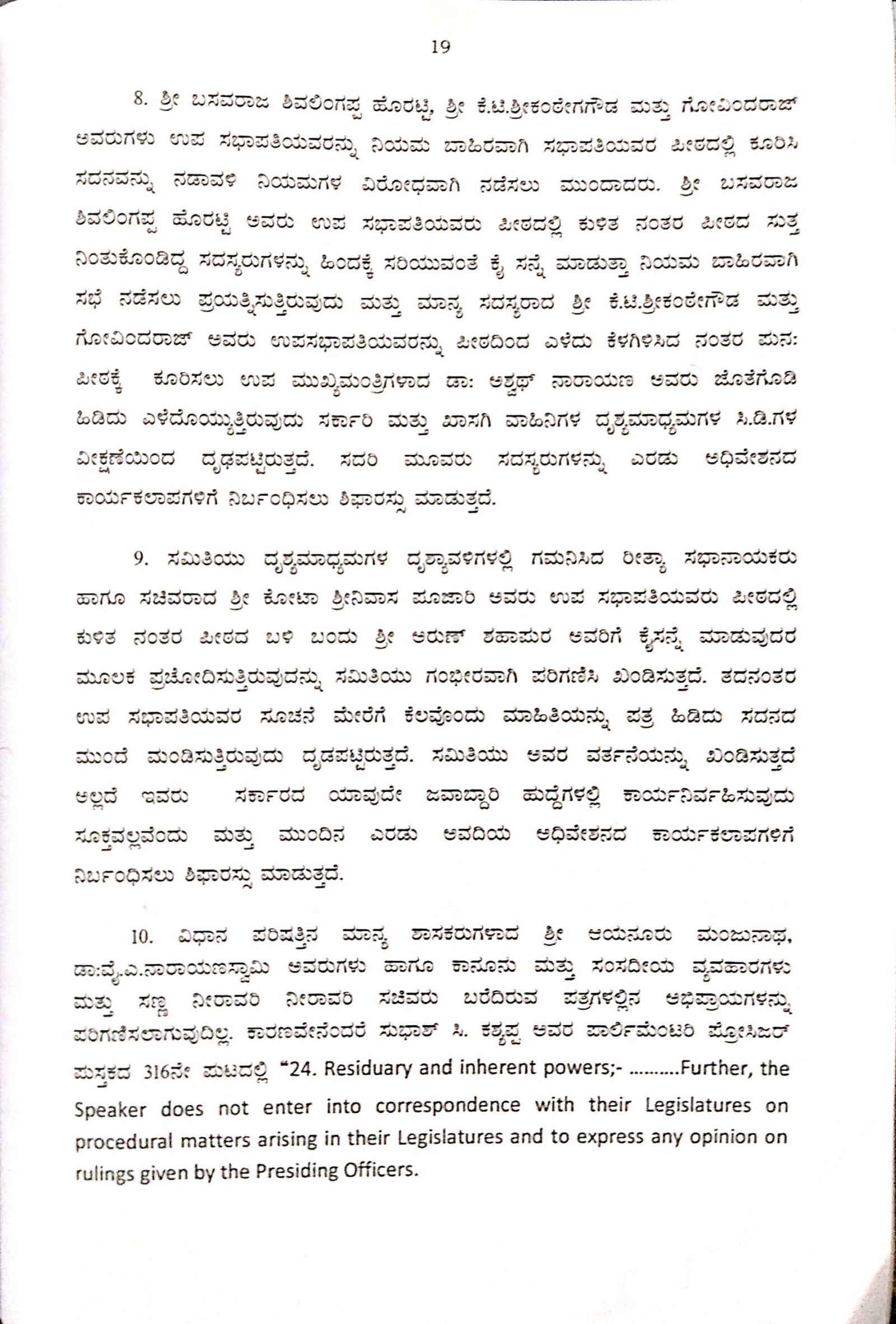 ‘ಬಸವರಾಜ ಶಿವಲಿಂಗಪ್ಪ ಹೊರಟ್ಟಿ, ಕೆ ಟಿ ಶ್ರೀಕಂಠೇಗೌಡ ಮತ್ತು ಗೋವಿಂದರಾಜ್ ಅವರು ಉಪ ಸಭಾಪತಿಯವರನ್ನು ನಿಯಮಬಾಹಿರವಾಗಿ ಸಭಾಪತಿಯವರ ಪೀಠದಲ್ಲಿ ಕೂರಿಸಿ ಸದನವನ್ನು ನಡಾವಳಿ ನಿಯಮಗಳ ವಿರೋಧವಾಗಿ ನಡೆಸಲು ಮುಂದಾದರು. ಬಸವರಾಜ ಹೊರಟ್ಟಿ ಅವರು ಉಪ ಸಭಾಪತಿಯವರು ಪೀಠದಲ್ಲಿ ಕುಳಿತ ನಂತರ ಪೀಠದ ಸುತ್ತ ನಿಂತುಕೊಂಡಿದ್ದ ಸದಸ್ಯರನ್ನು ಹಿಂದಕ್ಕೆ ಸರಿಯುವಂತೆ ಕೈ ಸನ್ನೆ ಮಾಡುತ್ತಾ ನಿಯಮಬಾಹಿರವಾಗಿ ಸಭೆ ನಡೆಸಲು ಪ್ರಯತ್ನಿಸುತ್ತಿರುವುದು ಮತ್ತು ಕೆ ಟಿ ಶ್ರೀಕಂಠೇಗೌಡ ಮತ್ತು ಗೋವಿಂದರಾಜ್ ಅವರು ಉಪ ಸಭಾಪತಿಯವರನ್ನು ಪೀಠದಿಂದ ಎಳೆದು ಕೆಳಗಿಳಿಸಿದ ನಂತರ ಪುನಃ ಪೀಠಕ್ಕೆ ಕೂರಿಸಲು ಉಪ ಮುಖ್ಯಮಂತ್ರಿಗಳಾದ ಡಾ ಅಶ್ವಥ್ ನಾರಾಯಣ್ ಅವರು ಜೊತೆಗೂಡಿ ಹಿಡಿದು ಎಳೆದೊಯ್ಯುತ್ತಿರುವುದು ಸರ್ಕಾರಿ ಮತ್ತು ಖಾಸಗಿ ವಾಹಿನಿಗಳ ದೃಶ್ಯ ಮಾಧ್ಯಮಗಳ ಸಿ ಡಿ ಗಳ ವೀಕ್ಷಣೆಯಿಂದ ದೃಢಪಟ್ಟಿರುತ್ತದೆ. ಈ ಮೂವರು ಸದಸ್ಯರುಗಳನ್ನು ಎರಡು ಅಧಿವೇಶನದ ಕಾರ್ಯಕಲಾಪಗಳಿಗೆ ನಿರ್ಬಂಧಿಸಲು ಶಿಫಾರಸ್ಸು ಮಾಡುತ್ತದೆ,’ ಎಂದು ಸದನ ಸಮಿತಿಯು ಮಧ್ಯಂತರ ವರದಿಯಲ್ಲಿ ಹೇಳಿದೆ.