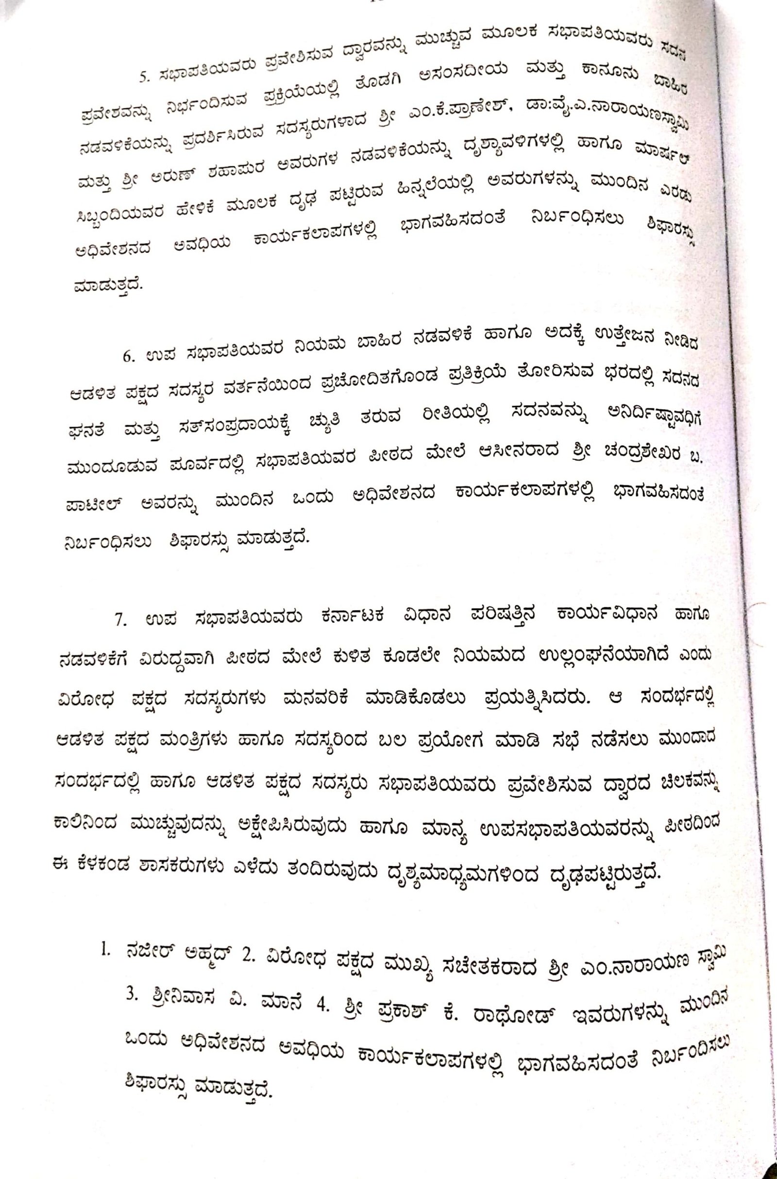 ಅದೇ ರೀತಿ ಸಭಾಪತಿಯವರು ಪ್ರವೇಶಿಸುವ ದ್ವಾರವನ್ನು ಮುಚ್ಚುವ ಮೂಲಕ ಸಭಾಪತಿಯವರು ಸದನ ಪ್ರವೇಶವನ್ನು ನಿರ್ಬಂಧಿಸುವ ಪ್ರಕ್ರಿಯೆಯಲ್ಲಿ ತೊಡಗಿ ಅಸಂಸದೀಯ ಮತ್ತು ಕಾನೂನುಬಾಹಿರ ನಡವಳಿಕೆ ಪ್ರದರ್ಶಿಸಿದ್ದರು ಎಂಬ ಆರೋಪಕ್ಕೆ ಗುರಿಯಾಗಿದ್ದ ಎಂ ಕೆ ಪ್ರಾಣೇಶ್, ಡಾ ವೈ ಎ ನಾರಾಯಣಸ್ವಾಮಿ, ಅರುಣ್ ಶಹಾಪುರ, ಚಂದ್ರಶೇಖರ ಬ ಪಾಟೀಲ್ ಮತ್ತು ಆಡಳಿತ ಪಕ್ಷದ ಸದಸ್ಯರು ಸಭಾಪತಿಯವರು ಪ್ರವೇಶಿಸುವ ದ್ವಾರದ ಚಿಲಕವನ್ನು ಕಾಲಿನಿಂದ ಮುಚ್ಚುವುದನ್ನು ಆಕ್ಷೇಪಿಸಿರುವುದು ಮತ್ತು ಉಪ ಸಭಾಪತಿಯವರನ್ನು ಪೀಠದಿಂದ ಎಳೆದು ತಂದ ಆರೋಪಕ್ಕೆ ಗುರಿಯಾಗಿದ್ದ ನಜೀರ್ ಅಹ್ಮದ್, ಪರಿಷತ್ನ ಮುಖ್ಯ ಸಚೇತಕ ಎಂ ನಾರಾಯಣಸ್ವಾಮಿ, ಶ್ರೀನಿವಾಸ ವಿ ಮಾನೆ, ಪ್ರಕಾಶ್ ಕೆ ರಾಥೋಡ್ ಇವರನ್ನು ಒಂದು ಅಧಿವೇಶನದ ಅವಧಿಯ ಕಾರ್ಯಕಲಾಪಗಳಲ್ಲಿ ಭಾಗವಹಿಸದಂತೆ ನಿರ್ಬಂಧಿಸಲು ಸಮಿತಿಯು ಶಿಫಾರಸ್ಸು ಮಾಡಿರುವುದು ವರದಿಯಿಂದ ತಿಳಿದು ಬಂದಿದೆ.