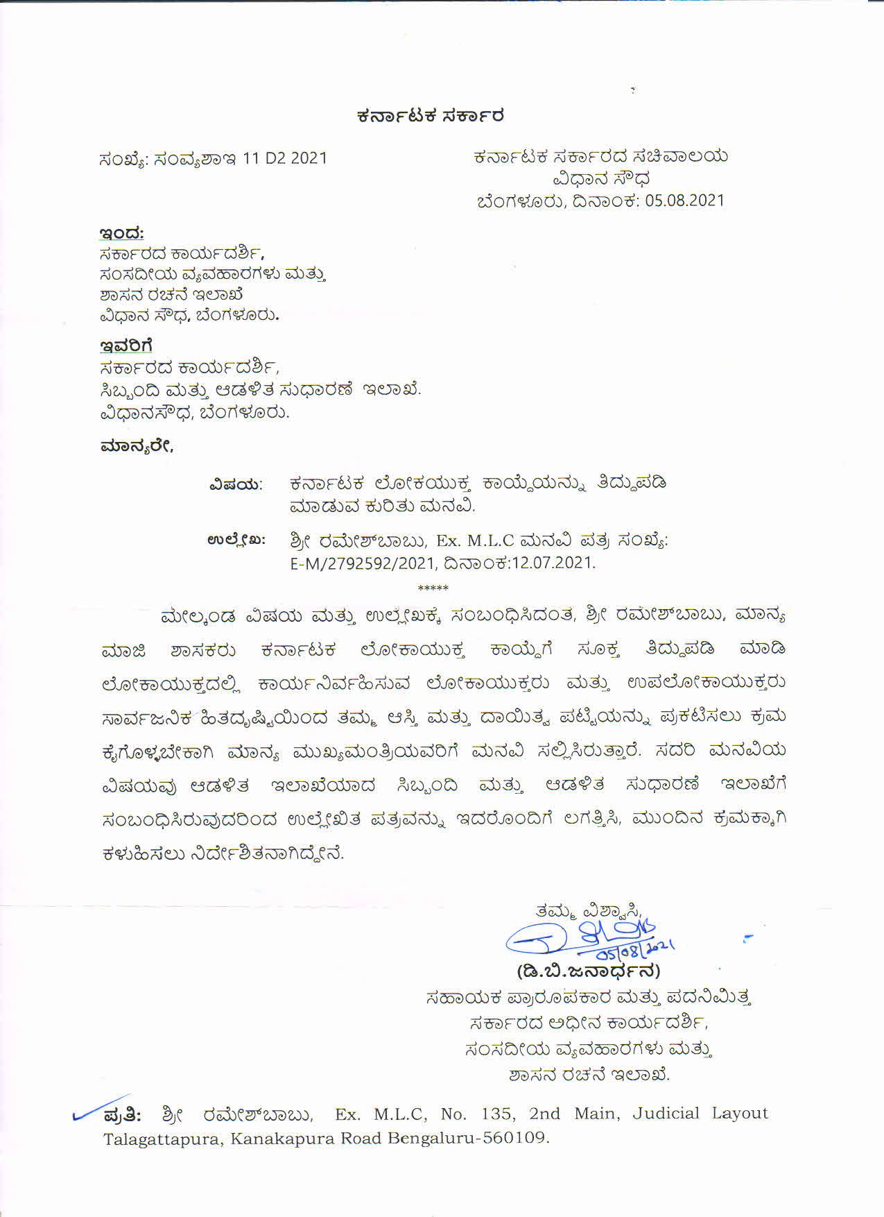ಲೋಕಾಯುಕ್ತರು ಮತ್ತು ಉಪ ಲೋಕಾಯುಕ್ತರು ಆಸ್ತಿ ಮತ್ತು ದಾಯಿತ್ವ ಪಟ್ಟಿ ಸಲ್ಲಿಸುವ ಸಂಬಂಧ ವಿಧಾನಪರಿಷತ್ನ ಮಾಜಿ ಸದಸ್ಯ ರಮೇಶ್ ಬಾಬು ಅವರು ಮುಖ್ಯಮಂತ್ರಿಗಳಿಗೆ ಮನವಿ ಸಲ್ಲಿಸಿದ್ದರು. ಈ ಮನವಿ ಅಧರಿಸಿ ಕ್ರಮ ಕೈಗೊಳ್ಳಬೇಕಿದ್ದ ಸಂಸದೀಯ ವ್ಯವಹಾರಗಳು ಮತ್ತು ಶಾಸನ ರಚನೆ ಇಲಾಖೆಯು ಮನವಿಯನ್ನು ಸಿಬ್ಬಂದಿ ಆಡಳಿತ ಸುಧಾರಣೆ ಇಲಾಖೆಗೆ ವರ್ಗಾಯಿಸಿ ಕೈತೊಳೆದುಕೊಂಡಿದೆ.