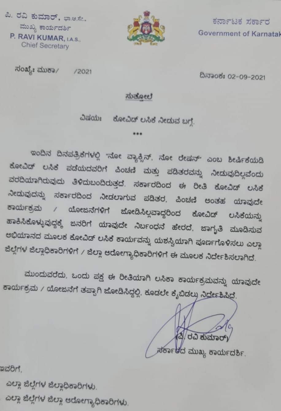 ಈ ಕುರಿತು ಸೆ. 2ರಂದು ಸುತ್ತೋಲೆ ಹೊರಡಿಸಿದ್ದಾರೆ. ಕೋವಿಡ್ ಲಸಿಕೆ ಪಡೆಯದವರಿಗೆ ಪಡಿತರ ನೀಡಬಾರದು ಎಂದು ಕೋಲಾರ ಜಿಲ್ಲೆಯ ಚಿಂತಾಮಣಿ ತಾಲೂಕಿನ ತಹಶೀಲ್ದಾರ್ ಪಡಿತರ ಸ್ಥಗಿತಗೊಳಿಸುವಂತೆ ನ್ಯಾಯಬೆಲೆ ಅಂಗಡಿ ಪ್ರಾಧಿಕಾರದವರಿಗೆ 2021ರ ಆಗಸ್ಟ್ 21ರಂದು ಜ್ಞಾಪನ ಪತ್ರದಲ್ಲಿ ಸೂಚಿಸಿದ್ದರು. ‘ವ್ಯಾಕ್ಸಿನ್ ಪಡೆಯದೇ ಇರುವ ಪಡಿತರ ಚೀಟಿದಾರರಿಗೆ ಪಡಿತರವನ್ನು ನೀಡಲಾಗುವುದಿಲ್ಲ ಎಂಬ ಬಗ್ಗೆ ಸೂಚನಾ ಫಲಕವನ್ನು ನ್ಯಾಯಬಲೆ ಅಂಗಡಿಯ ಮುಂದೆ ಕಡ್ಡಾಯವಾಗಿ ಪ್ರಕಟಿಸುವುದು,’ ಎಂದು ಸೂಚಿಸಿರುವುದು ಜ್ಞಾಪನ ಪತ್ರದಲ್ಲಿ ಸೂಚಿಸಿದ್ದರು.