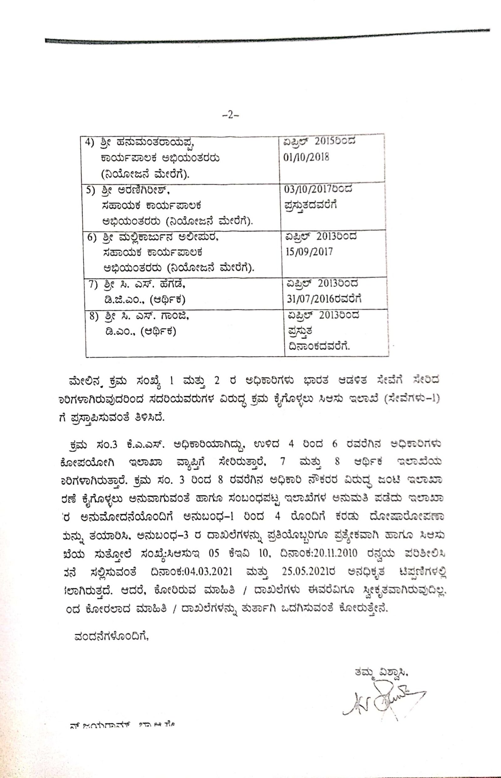 ಕಳೆದ ಮಾರ್ಚ್ ಮತ್ತು ಮೇ ತಿಂಗಳಿನಲ್ಲಿ ಸಿಬ್ಬಂದಿ ಮತ್ತು ಆಡಳಿತ ಸುಧಾರಣೆ ಇಲಾಖೆಯು ಪತ್ರ ಬರೆದಿದ್ದರೂ ಸಹಕಾರ ಇಲಾಖೆಯ ಹಿಂದಿನ ಪ್ರಧಾನ ಕಾರ್ಯದರ್ಶಿ ತುಷಾರ್ ಗಿರಿನಾಥ್ ಅವರು ಯಾವುದೇ ಕ್ರಮ ಕೈಗೊಂಡಿರಲಿಲ್ಲ. ಹೀಗಾಗಿ ಸಿಬ್ಬಂದಿ ಆಡಳಿತ ಸುಧಾರಣೆ ಇಲಾಖೆಯು ಇಲಾಖೆಯ ಪ್ರಧಾನ ಕಾರ್ಯದರ್ಶಿ ಎನ್ ಜಯರಾಮ್ ಅವರಿಗೆ ಪತ್ರ ಬರೆದಿದ್ದಾರೆ. ಈ ಪತ್ರದ ಮೇಲೂ ಇಲಾಖೆಯು ಕ್ರಮ ಕೈಗೊಂಡಿಲ್ಲ ಎಂದು ತಿಳಿದು ಬಂದಿದೆ.