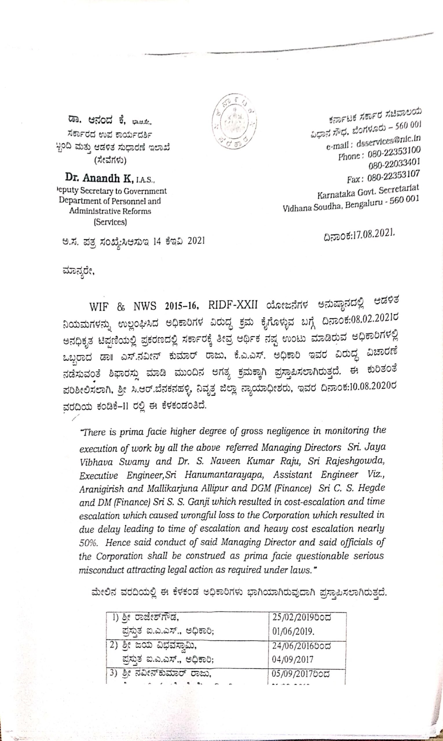 ನಿಗಮಕ್ಕೆ ಕೋಟ್ಯಂತರ ರುಪಾಯಿ ನಷ್ಟವಾಗಿರುವ ಪ್ರಕರಣದಲ್ಲಿ ಬಿಡಿಎ ಆಯುಕ್ತ ಐಎಎಸ್ ಅಧಿಕಾರಿ ರಾಜೇಶ್ಗೌಡ, ಚೆಸ್ಕಾಂ ವ್ಯವಸ್ಥಾಪಕ ನಿರ್ದೇಶಕ ಐಎಎಸ್ ಅಧಿಕಾರಿ ಜಯ ವಿಭವಸ್ವಾಮಿ, ಕೆಎಎಸ್ ಅಧಿಕಾರಿ ಡಾ ಎನ್ ನವೀನ್ಕುಮಾರ್ ರಾಜು, ಕಾರ್ಯಪಾಲಕ ಅಭಿಯಂತರ ಹನುಮಂತರಾಯಪ್ಪ, ಸಹಾಯಕ ಕಾರ್ಯಪಾಲಕ ಅಭಿಯಂತರ ಅರಣಿ ಗಿರೀಶ್, ಮಲ್ಲಿಕಾರ್ಜುನ ಆಲೀಪುರ, ಸಿ ಎಸ್ ಹೆಗಡೆ ಮತ್ತು ಸಿ ಎಸ್ ಗಾಂಜಿ ಅವರ ವಿರುದ್ಧ ಕ್ರಮ ಕೈಗೊಳ್ಳಲು ಸಿಬ್ಬಂದಿ ಆಡಳಿತ ಸುಧಾರಣೆ ಇಲಾಖೆಯ ಸರ್ಕಾರದ ಉಪ ಕಾರ್ಯದರ್ಶಿ ಡಾ ಆನಂದ ಕೆ ಅವರು ಸಹಕಾರ ಇಲಾಖೆಗೆ 2021ರ ಆಗಸ್ಟ್ 17ರಂದು ಪತ್ರ ಬರೆದಿದ್ದರು.