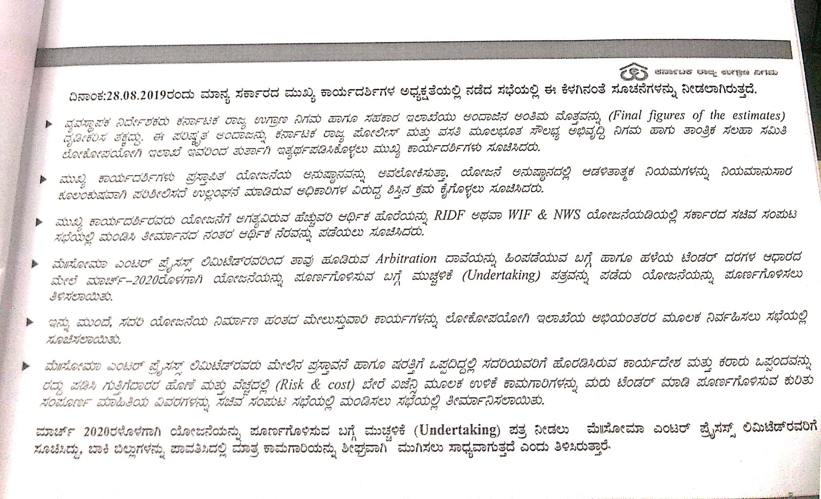ಈ ಮಧ್ಯೆ ಯೋಜನೆಯ ಅನುಷ್ಠಾನದ ಕುರಿತು ಗುತ್ತಿಗೆದಾರರಾದ ಸೋಮ ಎಂಟರ್ಪ್ರೈಸೆಸ್ ಲಿಮಿಟೆಡ್ ಅರ್ಬಿಟ್ರೇಷನ್ನಲ್ಲಿ ದಾವೆ ಹೂಡಿತ್ತು. ನಿಗಮದ ವತಿಯಿಂದ 435.00 ಕೋಟಿ ರು.ಗಳಿಗೆ ಸೋಮಾ ಎಂಟರ್ಪ್ರೈಸೆಸ್ ಕ್ಲೈಮ್ ಮಾಡಿತ್ತು. ಇದಕ್ಕೆ ಸಂಬಂಧಪಟ್ಟಂತೆ ನಿಗಮಕ್ಕೆ ಆಗಿರುವ ಆರ್ಥಿಕ ನಷ್ಟದ ಕುರಿತು ಪ್ರಾರಂಭಿಕ ಹಂತದಲ್ಲಿ 395.00 ಕೋಟಿ ರು.ಗಳಿಗೆ ಗುತ್ತಿಗೆದಾರರಿಂದ ಪಡೆಯಲು ಕೌಂಟರ್ ಕ್ಲೈಮ್ ಮಾಡಲಾಗಿತ್ತು.