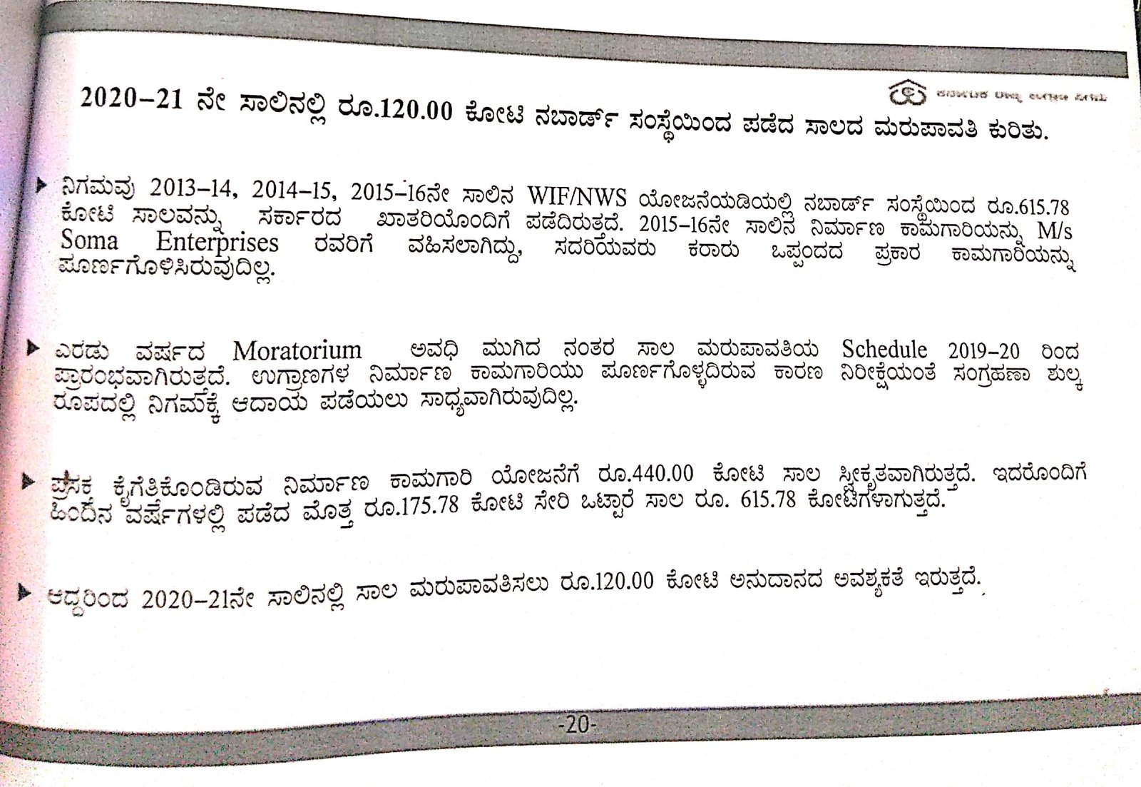 2013-14, 2014-15, 2015-16ನೆ ಸಾಲಿನ ಡಬ್ಲ್ಯೂಐಎಫ್, ಎನ್ಡಬ್ಲ್ಯೂಎಸ್ ಯೋಜನೆಯಡಿಯಲ್ಲಿ ನಬಾರ್ಡ್ ಸಂಸ್ಥೆಯಿಂದ 615.78 ಕೋಟಿ ಸಾಲವನ್ನು ಸರ್ಕಾರದ ಖಾತರಿಯೊಂದಿಗೆ ಪಡೆಇದತ್ತು. 2015-16ನೇ ಸಾಲಿನ ನಿರ್ಮಾಣ ಕಾಮಗಾರಿಯನ್ನು ವಹಿಸಿಕೊಂಡಿದ್ದ ಸೋಮಾ ಎಂಟರ್ಪ್ರೈಸೆಸ್ ಕರಾರು ಒಪ್ಪಂದದ ಪ್ರಕಾರ ಕಾಮಗಾರಿಯನ್ನು ಪೂರ್ಣಗೊಳಿಸಿರಲಿಲ್ಲ. ಹೀಗಾಗಿ ಬಾಡಿಗೆ ಆದಾಯದಲ್ಲಿಯೂ ಖೋತಾ ಆಗಿತ್ತು.