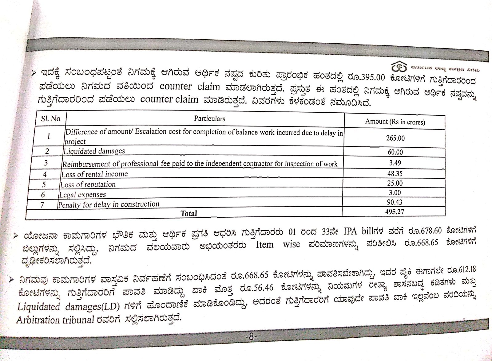 ನಿಗಮವು ಕಾಮಗಾರಿಗಳ ವಾಸ್ತವಿಕ ನಿರ್ವಹಣೆಗೆ ಸಂಬಂಧಿಸಿದಂತೆ 668.65 ಕೋಟಿ ರು.ಗಳನ್ನು ಪಾವತಿಸಬೇಕಾಗಿದ್ದು ಈ ಪೈಕಿ 612.18 ಕೋಟಿ ರು.ಗಳನ್ನು ಗುತ್ತಿಗೆದಾರರಿಗೆ ಪಾವತಿ ಮಾಡಲಾಗಿತ್ತು. ಬಾಕಿ ಮೊತ್ತ 56.46 ಕೋಟಿಗಳನ್ನು ನಿಯಮಗಳ ರೀತಿ ಶಾಸನಬದ್ಧ ಕಡಿತಗಳು ಮತ್ತು ಎಲ್ಡಿಗಳಿಗೆ ಹೊಂದಾಣಿಕೆ ಮಾಡಿಕೊಂಡಿತ್ತು. ಅದರಂತೆ ಗುತ್ತಿಗೆದಾರರಿಗೆ ಯಾವುದೆ ಪಾವತಿ ಬಾಕಿ ಇಲ್ಲವೆಂಬ ವರದಿಯನ್ನು ಆರ್ಬಿಟ್ರೇಷನ್ ಟ್ರಿಬ್ಯೂನಲ್ಗೆ ಸಲ್ಲಿಸಲಾಗಿತ್ತು ಎಂದು ತಿಳಿದು ಬಂದಿದೆ.