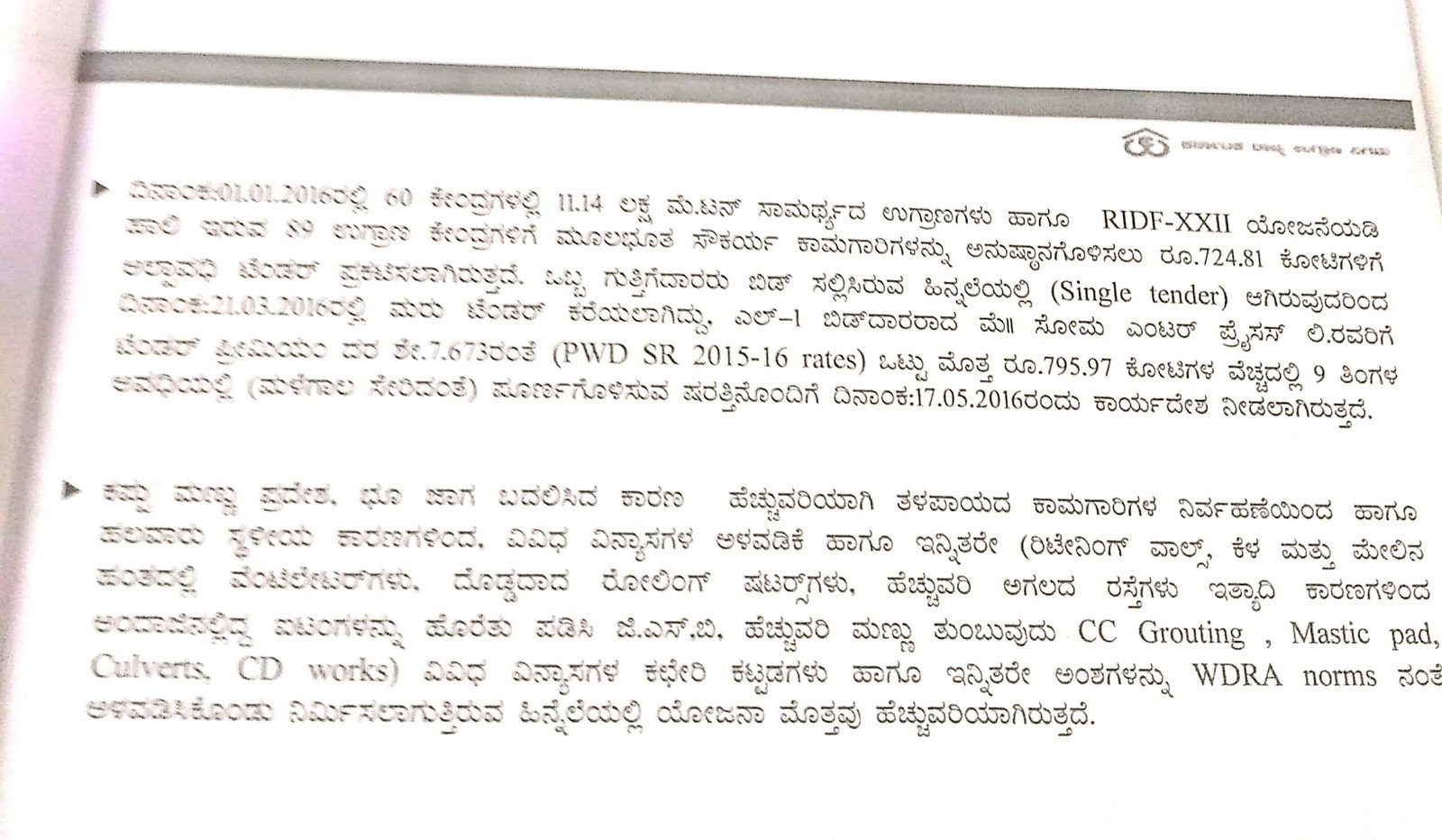 ಉಗ್ರಾಣಗಳ ಸಾಮರ್ಥ್ಯ ಅಭಿವೃದ್ಧಿ ಕಾಮಗಾರಿಗೆ 2016ರ ಮಾರ್ಚ್ 3 ರಂದು ಕರೆದಿದ್ದ ಟೆಂಡರ್ನಲ್ಲಿ ಸೋಮ ಎಂಟರ್ಪ್ರೈಸೆಸ್ ಟೆಂಡರ್ ಪ್ರೀಮಿಯಂ ದರದ ಶೇ.7.673ರಂತೆ ಒಟ್ಟು 795.97 ಕೋಟಿ ರು. ವೆಚ್ಚದಲ್ಲಿ 9 ತಿಂಗಳ ಅವಧಿಯಲ್ಲಿ ಪೂರ್ಣಗೊಳಿಸಲು 2016ರ ಮೇ 17ರಂದು ಹಿಂದಿನ ಕಾಂಗ್ರೆಸ್ ಸರ್ಕಾರವು ಕಾರ್ಯಾದೇಶ ನೀಡಿತ್ತು.