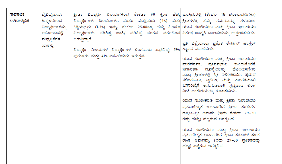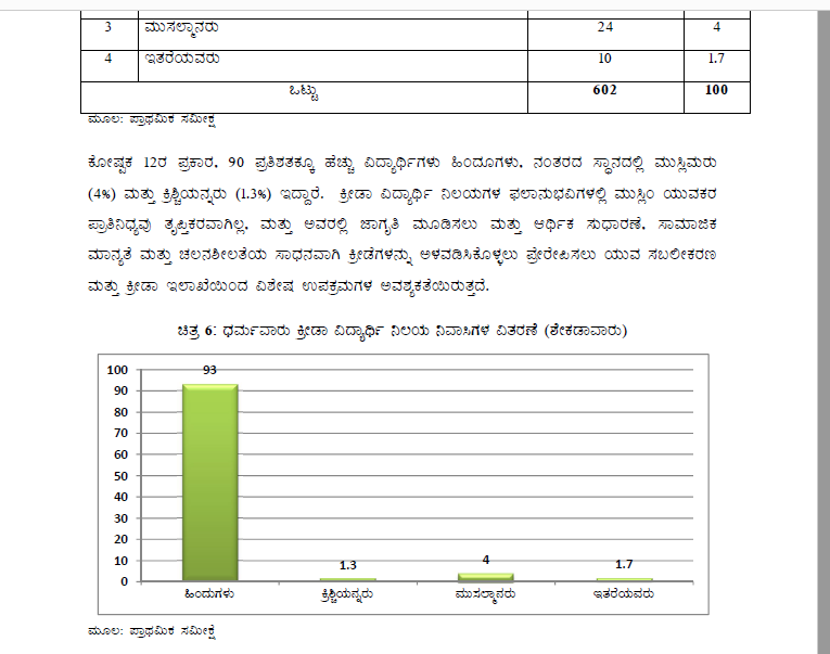 ಕ್ರೀಡಾ ವಿದ್ಯಾರ್ಥಿ ನಿಲಯಗಳಿಗೆ ಬರುತ್ತಿರುವ ಹಿಂದೂ ವಿದ್ಯಾರ್ಥಿಗಳ ಪೈಕಿ ಶೇ.25.08ರಷ್ಟು ವಿದ್ಯಾರ್ಥಿಗಳು ಪರಿಶಿಷ್ಟ ಜಾತಿ ಮತ್ತು ಪರಿಶಿಷ್ಟ ಪಂಗಡಕ್ಕೆ ಸೇರಿದವರು. ಉಳಿದಂತೆ ಕ್ರಿಶ್ಚಿಯನ್ನರು ಶೇ. 1.3ರಷ್ಟಿದ್ದಾರೆ. ಮುಸ್ಲಿಂ ಯುವಕರಲ್ಲಿ ಕ್ರೀಡೆ ಕುರಿತು ಜಾಗೃತಿ ಮೂಡಿಸುವುದು, ಅರ್ಥಿಕ ಸುಧಾರಣೆ, ಸಾಮಾಜಿಕ ಮಾನ್ಯತೆ ಮತ್ತು ಚಲನಶೀಲತೆಯ ಸಾಧನವಾಗಿ ಕ್ರೀಡೆ ಚಟುವಟಿಕೆಗಳಲ್ಲಿ ತೊಡಗಿಸಿಕೊಳ್ಳುವಂತೆ ಪ್ರೇರೇಪರಿಸಲು ಯುವ ಸಬಲೀಕರಣ ಮತ್ತು ಕ್ರೀಡಾ ಇಲಾಖೆಯು ವಿಶೇಷ ಕ್ರಮಗಳನ್ನು ಕೈಗೊಳ್ಳಬೇಕು ಎಂದು ಅಧ್ಯಯನ ವರದಿಯು ಶಿಫಾರಸ್ಸು ಮಾಡಿದೆ.