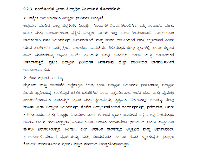 ಕ್ರೀಡಾ ವಿದ್ಯಾರ್ಥಿ ನಿಲಯಗಳಲ್ಲಿ ಲಿಂಗ ಆಧರಿತ ತಾರತಮ್ಯವಿದೆ. ಮಹಿಳಾ ಕ್ರೀಡಾಪಟುಗಳಿಗೆ ಕಿರುಕುಳ ನೀಡಿದ ಉದಾಹರಣೆಗಳೂ ಇವೆ. ಅಂತಹ ಪ್ರಕರಣಗಳ ಯಾವುದೇ ಬಹಿರಂಗಪಡಿಸುವಿಕೆಯ ಪ್ರತಿಕೂಲ ಪರಿಣಾಮಗಳ ಭಯವು ಅನೇಕರು ಯಾವುದೇ ಔಪಚಾರಿಕ ದೂರು ನೀಡುವುದನ್ನು ತಡೆದಿದಿರುವುದು ವರದಿಯಿಂದ ತಿಳಿದು ಬಂದಿದೆ.