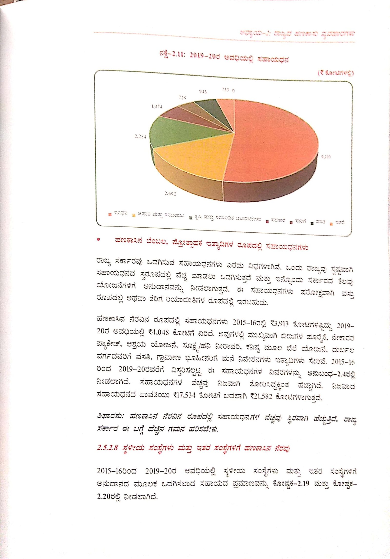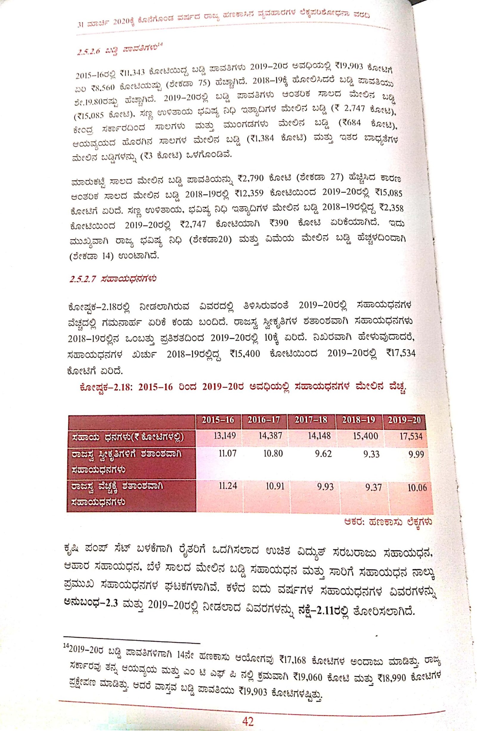 2015-16ರಲ್ಲಿ 3,913 ಕೋಟಿಗಳಷ್ಟಿದ್ದು 2019-20ರಲ್ಲಿ 4,048 ಕೋಟಿಗೆ ಏರಿದೆ. ಬೀಜಗಳ ಪೂರೈಕೆ, ನೇಕಾರರ ಪ್ಯಾಕೇಜ್, ಆಶ್ರಯ ಯೋಜನೆ, ಸೂಕ್ಷ್ಮ ಹನಿ ನೀರಾವರಿ, ಕನಿಷ್ಠ ಮೂಲ ಬೆಲೆ ಯೋಜನೆ, ದುರ್ಬಲ ವರ್ಗದವರಿಗೆ ವಸತಿ, ಗ್ರಾಮೀಣ ಭೂ ಹೀನರಿಗೆ ಮನೆ ನಿವೇಶನಗಳು ಇದರಲ್ಲಿ ಸೇರಿವೆ. ಆದರೆ ಸಹಾಯಧನಗಳ ವೆಚ್ಚವು ನಿಜವಾಗಿ ತೋರಿಸಿದ್ದಕ್ಕಿಂತ ಹೆಚ್ಚಾಗಿದೆ.