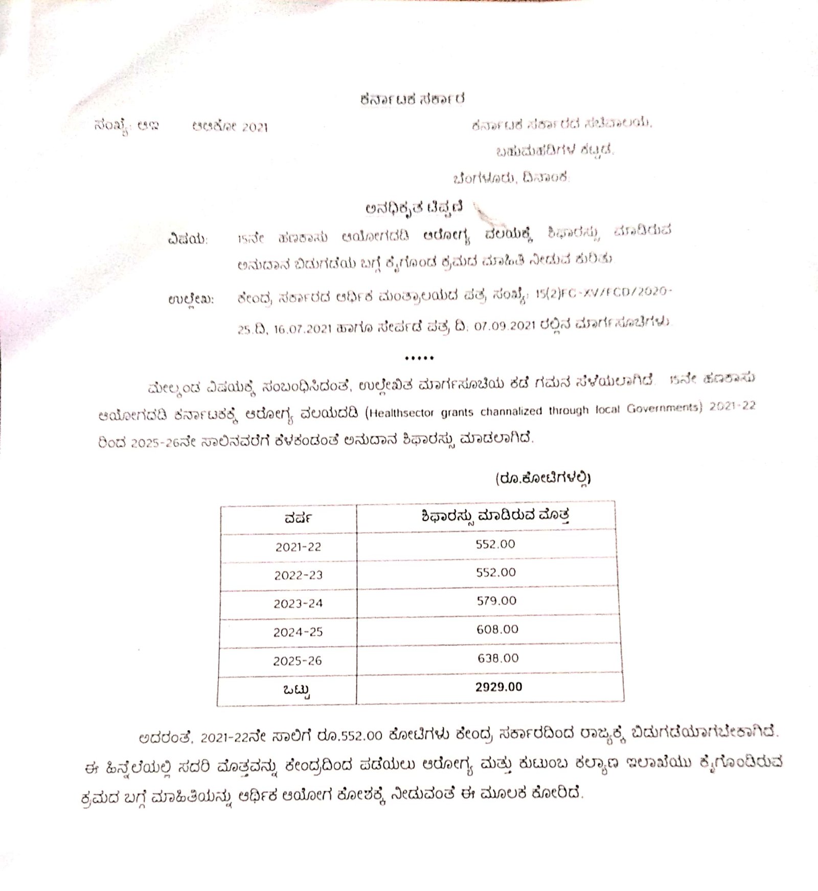 ಬೆಂಗಳೂರು; ಹದಿನೈದನೇ ಹಣಕಾಸು ಆಯೋಗ 2020–21ನೇ ಸಾಲಿನ ವರದಿಯಲ್ಲಿ ಕರ್ನಾಟಕಕ್ಕೆ ಆರೋಗ್ಯ ವಲಯಕ್ಕೆ 2021-22ರಿಂದ 2025-26ರ ವರ್ಷದಲ್ಲಿ 2,929 ಕೋಟಿ ರು. ಶಿಫಾರಸ್ಸು ಮಾಡಿದೆಯಾದರೂ 2021-22ನೇ ಸಾಲಿಗೆ ಸಂಬಂಧಿಸಿದಂತೆ 552.00 ಕೋಟಿ ರು. ಈವರೆವಿಗೂ ಬಿಡುಗಡೆಗೊಂಡಿಲ್ಲ.