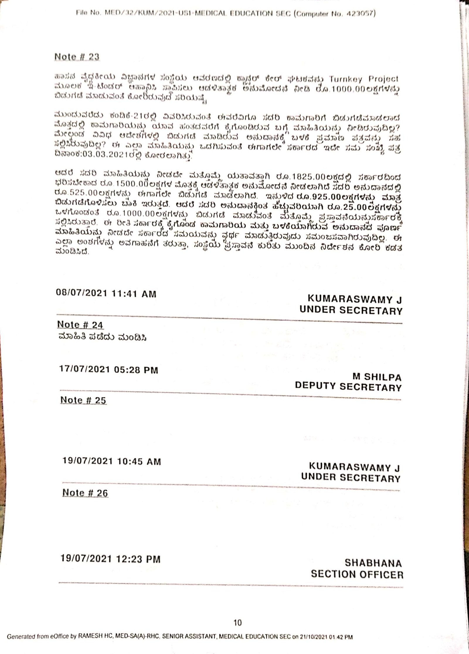 ‘ಈವರೆವಿಗೂ ಕಾಮಗಾರಿಗೆ ಬಿಡುಗಡೆ ಮಾಡಲಾದ ಮೊತ್ತದಲ್ಲಿ ಕಾಮಗಾರಿಯನ್ನು ಯಾವ ಹಂತದವರೆಗೆ ಕೈಗೊಂಡಿರುವ ಬಗ್ಗೆ ಮಾಹಿತಿಯನ್ನು ನೀಡಿರುವುದಿಲ್ಲ. ವಿವಿಧ ಆದೇಶಗಳಲ್ಲಿ ಬಿಡುಗಡೆ ಮಾಡಿರುವ ಅನುದಾನ ಬಳಕೆ ಪ್ರಮಾಣ ಪತ್ರವನ್ನು ಸಲ್ಲಿಸಿರುವುದಿಲ್ಲ. ಈ ಎಲ್ಲಾ ಮಾಹಿತಿಯನ್ನು ಒದಗಿಸುವಂತೆ ಸರ್ಕಾರವು 2021ರ ಮಾರ್ಚ್ 3ರಂದು ಪತ್ರ ಬರೆಯಲಾಗಿತ್ತು. ಆದರೆ ಈ ಯಾವ ಮಾಹಿತಿಯನ್ನೂ ನೀಡದೆಯೇ ಮತ್ತೊಮ್ಮೆ ಯಥಾವತ್ತಾಗಿ ಆಡಳಿತಾತ್ಮಕ ಅನುಮೋದನೆ ನೀಡಲಾದ ಅನುದಾನಕ್ಕಿಂತ ಹೆಚ್ಚುವರಿಯಾಗಿ 25.00 ಲಕ್ಷ ರು.ಗಳನ್ನು ಬಿಡುಗಡೆ ಮಾಡಬೇಕು ಎಂದು ಪ್ರಸ್ತಾವನೆ ಸಲ್ಲಿಸಿದೆ,’ ಎಂಬ ಮಾಹಿತಿ ಟಿಪ್ಪಣಿ ಹಾಳೆಯಿಂದ ತಿಳಿದು ಬಂದಿದೆ.
