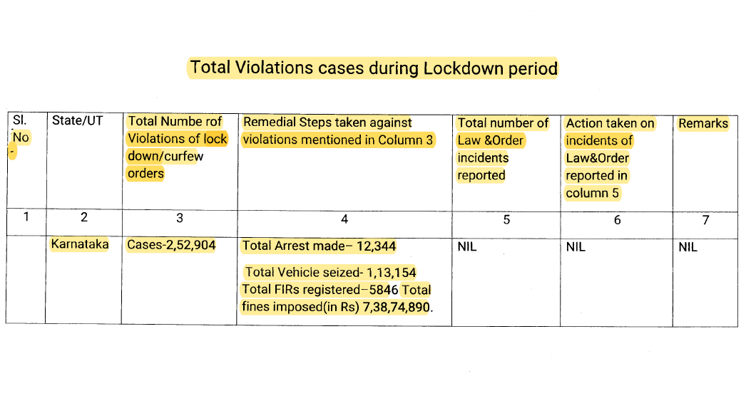 ಇದೇ ಅವಧಿಯಲ್ಲಿ ಕೋವಿಡ್ ಮಾರ್ಗಸೂಚಿಗಳನ್ನು ಉಲ್ಲಂಘಿಸಿದ್ದರು ಎಂಬ ಆರೋಪದಡಿಯಲ್ಲಿ ರಾಜ್ಯಾದಾದ್ಯಂತ ಒಟ್ಟು 2,52,904 ಪ್ರಕರಣಗಳನ್ನು ದಾಖಲಿಸಿಕೊಳ್ಳಲಾಗಿತ್ತು. ಈ ಪೈಕಿ 12,344 ಮಂದಿಯನ್ನು ಬಂಧಿಸಲಾಗಿತ್ತು. 1,13,154 ವಾಹನಗಳನ್ನು ಜಫ್ತಿ ಮಾಡಿಕೊಳ್ಳಲಾಗಿತ್ತಲ್ಲದೆ 5,846 ಎಫ್ಐಆರ್ಗಳನ್ನು ದಾಖಲಿಸಲಾಗಿತ್ತು. ಅದೇ ರೀತಿ 7,38,74,890 ರು. ಗಳ ದಂಡವನ್ನೂ ವಿಧಿಸಲಾಗಿತ್ತು ಎಂದು ರಾಜ್ಯ ಸರ್ಕಾರವು ಹೈಕೋರ್ಟ್ಗೆ ಮಾಹಿತಿಯನ್ನು ನೀಡಿತ್ತು.