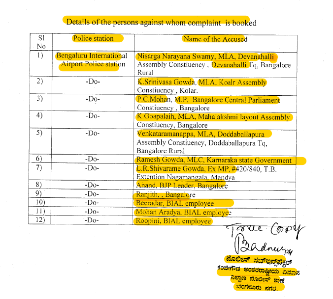 ಅದೇ ರೀತಿ ಕೆಂಪೇಗೌಡರ ಕಂಚಿನ ಪ್ರತಿಮೆ ಸ್ಥಾಪನೆ ಸಂಬಂಧ ನಡೆದಿದ್ದ ಶಂಕು ಸ್ಥಾಪನೆ ಕಾರ್ಯಕ್ರಮದಲ್ಲಿ ಭಾಗವಹಿಸಿದ್ದ ಚುನಾಯಿತ ಜನಪ್ರತಿನಿಧಿಗಳು ಮಾಸ್ಕ್, ಸಾಮಾಜಿಕ ಅಂತರ ಸೇರಿದಂತೆ ಇತರೆ ನಿಯಮಗಳನ್ನು ಉಲ್ಲಂಘಿಸಿರುವ ಆರೋಪಕ್ಕೆ ಗುರಿಯಾಗಿದ್ದರು. ಈ ಸಂಬಂಧ ಕೆಂಪೇಗೌಡ ಅಂತಾರಾಷ್ಟ್ರೀಯ ವಿಮಾನ ನಿಲ್ದಾಣ ಪೊಲೀಸ್ ಠಾಣೆಯ ಪೊಲೀಸ್ ಸಬ್ ಇನ್ಸ್ಪೆಕ್ಟರ್ ಅವರು ಹೈಕೋರ್ಟ್ಗೆ ಪಾಲನಾ ವರದಿ ಸಲ್ಲಿಸಿದ್ದರು.