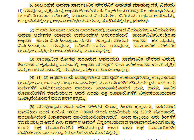 ಅದೇ ರೀತಿ ಈ ಅಧಿನಿಯಮದ ಅಥವಾ ಅದರಡಿಯಲ್ಲಿ ಮಾಡಲಾದ ನಿಯಮಗಳೂ, ವಿನಿಯಮಗಳು ಅಥವಾ ಆದೇಶಗಳ ಯಾವುದೇ ಉಪಬಂಧಗಳ ಅನುಸರಣೆಯಲ್ಲಿ ಕಾರ್ಯನಿರ್ವಹಿಸುತ್ತಿರುವ ಅಥವಾ ಕಾರ್ಯನಿರ್ವಹಿಸುತ್ತಿರುವನೆಂದು ಅಥವಾ ಕರ್ತವ್ಯವನ್ನು ನಿರ್ವಹಿಸುತ್ತಿರುವ ಯಾವೊಬ್ಬ ಅಧಿಕಾರಿ ಅಥವಾ ಯಾವೊಬ್ಬ ಸಾರ್ವಜನಿಕ ನೌಕರನಿಗೆ ಯಾವೊಬ್ಬ ವ್ಯಕ್ತಿಯು ಅಡಚಣೆಯನ್ನು ಮಾಡತಕ್ಕದ್ದಲ್ಲ ಎಂದು ವಿವರಿಸಲಾಗಿದೆ.