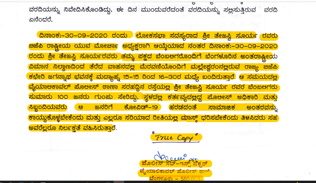 ಆ ಸಮಯದಲ್ಲಿ ವೈಯಾಲಿಕಾವಲ್ ಪೊಲೀಸ್ ಠಾಣೆ ಸರಹದ್ದಿನ ರಸ್ತೆಯಲ್ಲಿ ತೇಜಸ್ವಿ ಸೂರ್ಯಾ ವರ ಬೆಂಬಲಿಗರು ಸುಮಾರು 100 ಜನರು ಗುಂಪು ಸೇರಿದ್ದು ಸ್ಥಳದಲ್ಲಿ ಕರ್ತವ್ಯದಲ್ಲಿದ್ದ ಪೊಲೀಸ್ ಅಧಿಕಾರಿ ಮತ್ತು ಸಿಬ್ಬಂದಿ ಆ ಜನರಿಗೆ ಕೋವಿಡ್-19 ಹರಡದಂತೆ ಸಾಮಾಜಿಕ ಅಂತರವನ್ನು ಕಾಯ್ದುಕೊಳ್ಳಬೇಕೆಂದು ಮತ್ತು ಎಲ್ಲರೂ ಸರಿಯಾದ ರೀತಿಯಲ್ಲಿ ಮಾಸ್ಕ್ ಧರಿಸಬೇಕು ಎಂದು ತಿಳಿಸಿದ್ದರೂ ಅವರೆಲ್ಲರೂ ನಿರ್ಲಕ್ಷ್ಯ ವಹಿಸಿದ್ದರು ಎಂದು ವೈಯಾಲಿಕಾವಲ್ ಪೊಲೀಸ್ ಠಾಣೆಯ ಸಬ್ ಇನ್ಸ್ಪೆಕ್ಟರ್ ಅವರು ನ್ಯಾಯಾಲಯಕ್ಕೆ 2020ರ ನವೆಂಬರ್ 4ರಂದು ವರದಿ ಮಾಡಿದ್ದರು.
