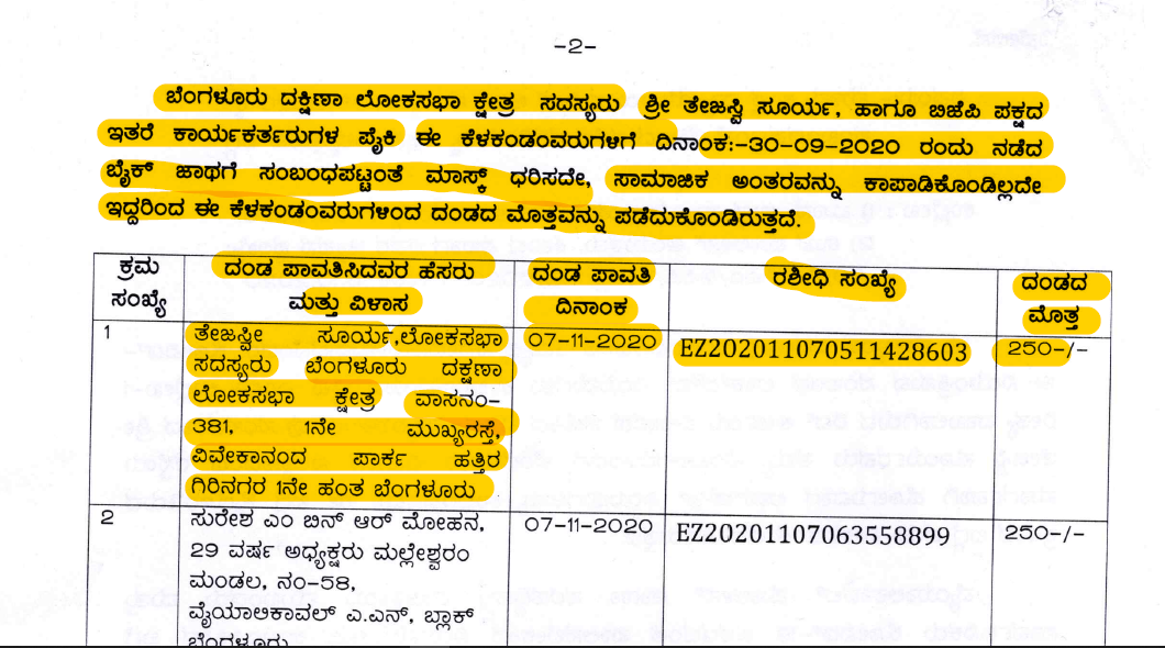 ಅಷ್ಟೇ ಅಲ್ಲದೆ ತೇಜಸ್ವಿ ಸೂರ್ಯ ಮತ್ತು ಬಿಜೆಪಿ ಪಕ್ಷದ ಇತರೆ ಕಾರ್ಯಕರ್ತರುಗಳು 2020ರ ಸೆಪ್ಟಂಬರ್ 30ರಂದು ನಡೆದಿದ್ದ ಬೈಕ್ ಜಾಥಾದಲ್ಲಿ ಮಾಸ್ಕ್ ಧರಿಸಿರಲಿಲ್ಲ ಮತ್ತು ಸಾಮಾಜಿಕ ಅಂತರ ಕಾಪಾಡಿರಲಿಲ್ಲ. ಆದರೂ ಪೊಲೀಸ್ ಅಧಿಕಾರಿಗಳು ಕರ್ನಾಟಕ ಸಾಂಕ್ರಾಮಿಕ ರೋಗಗಳ ಅಧಿನಿಯಮ 2020 ರಡಿ ಕ್ರಮ ಕೈಗೊಂಡಿಲಿಲ್ಲ. ಬದಲಿಗೆ ಅತ್ಯಲ್ಪ ಪ್ರಮಾಣದ ಅಂದರೆ 250 ರು. ದಂಡ ವಿಧಿಸಿದ್ದರು. ತೇಜಸ್ವಿ ಸೂರ್ಯ (ರಶೀದಿ ಸಂಖ್ಯೆ; EZ202011070511428603)ಸೇರಿ ಬಿಜೆಪಿಯ ಇತರೆ ಕಾರ್ಯಕರ್ತರು 250 ರು. ದಂಡ ಪಾವತಿಸಿದ್ದರು.