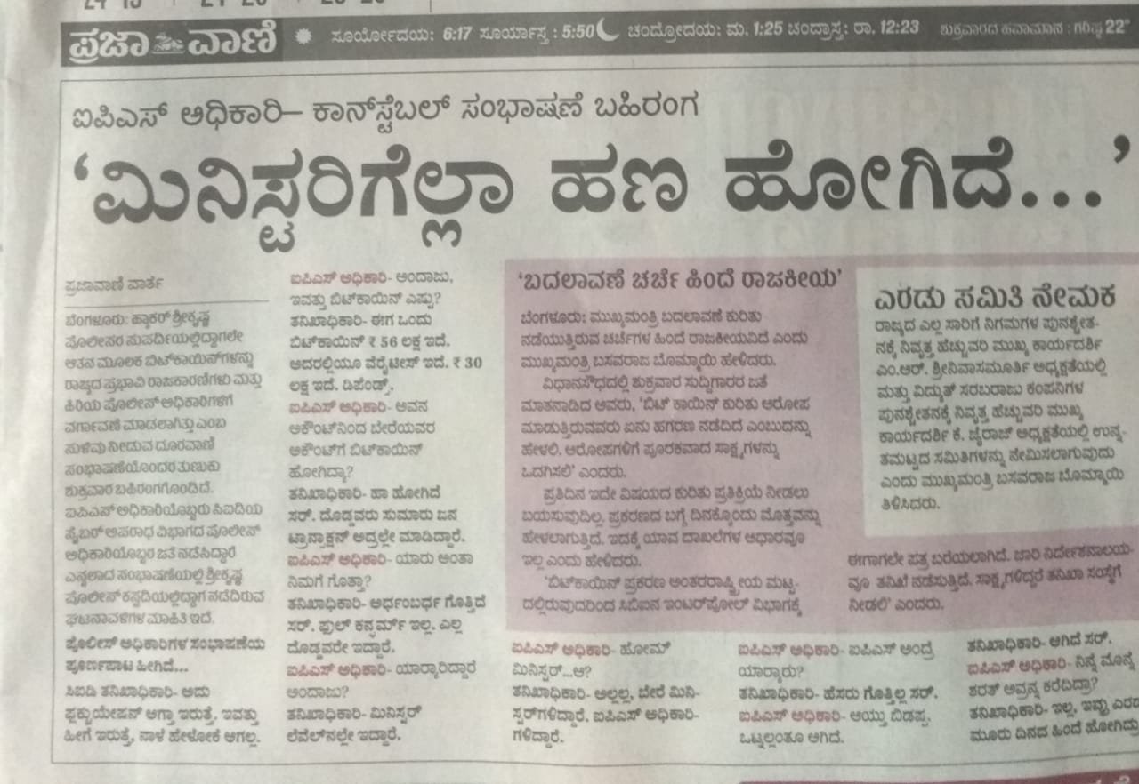 ಬಿಟ್ ಕಾಯಿನ್ ಹಗರಣಕ್ಕೆ ಸಂಬಂಧಿಸಿದಂತೆ ಆಪ್ತ ಐಪಿಎಸ್ ಅಧಿಕಾರಿಗಳಿಗೆ ಮಾಹಿತಿ ಸೋರಿಕೆ ಮಾಡಿರುವ ಆಡಿಯೋದಲ್ಲಿದ್ದ ಸಂಭಾಷಣೆಯನ್ನು ‘ದಿ ಫೈಲ್’ 2021ರ ನವೆಂಬರ್ 12ರಂದು ವರದಿ ಪ್ರಕಟಿಸಿತ್ತು.