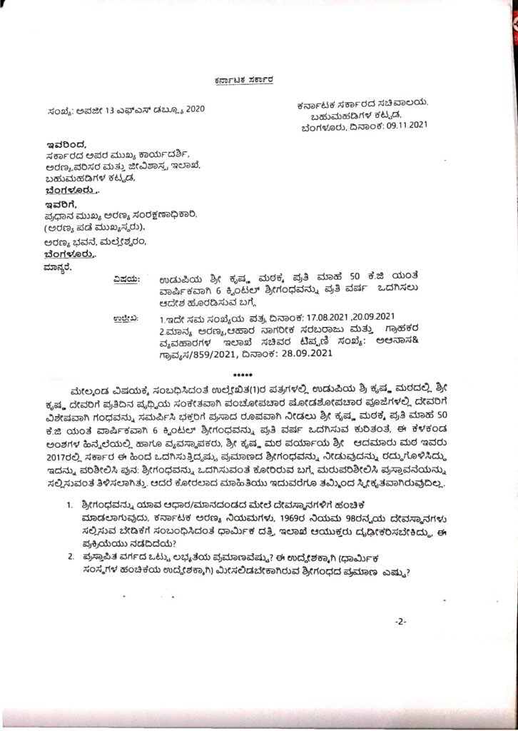 ಉಡುಪಿಯ ಶ್ರೀ ಕೃಷ್ಣ ಮಠಕ್ಕೆ ಶ್ರೀಗಂಧ ಮಂಜೂರಾತಿ ವಿಚಾರಕ್ಕೆ ಸಂಬಂಧಿಸಿದಂತೆ ಸೂಕ್ತ ಆದೇಶ ಹೊರಡಿಸುವ ಸಂಬಂಧ ಮಾಹಿತಿ ಕೋರಿರುವ ಅರಣ್ಯ, ಪರಿಸರ ಮತ್ತು ಜೀವಿಶಾಸ್ತ್ರ ಇಲಾಖೆಯ ಸರ್ಕಾರದ ಹೆಚ್ಚುವರಿ ಮುಖ್ಯಕಾರ್ಯದರ್ಶಿಗಳು 2021ರ ನವೆಂಬರ್ 9ರಂದು ಅರಣ್ಯ ಪಡೆ ಮುಖ್ಯಸ್ಥರಿಗೆ ಪತ್ರ ಬರೆದಿದ್ದಾರೆ. ಈ ಪತ್ರದ ಪ್ರತಿ ‘ದಿ ಫೈಲ್’ಗೆ ಲಭ್ಯವಾಗಿದೆ.