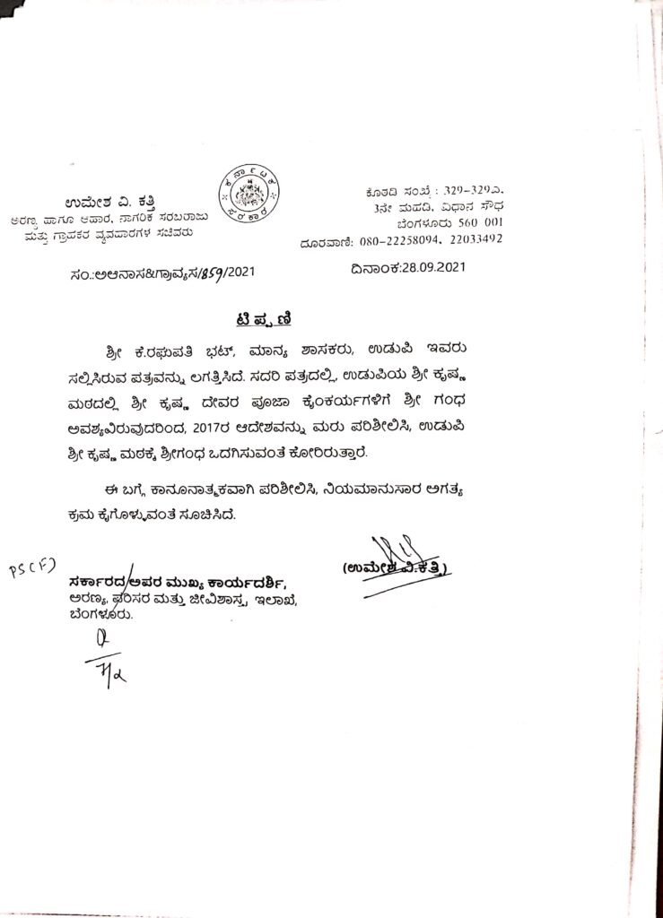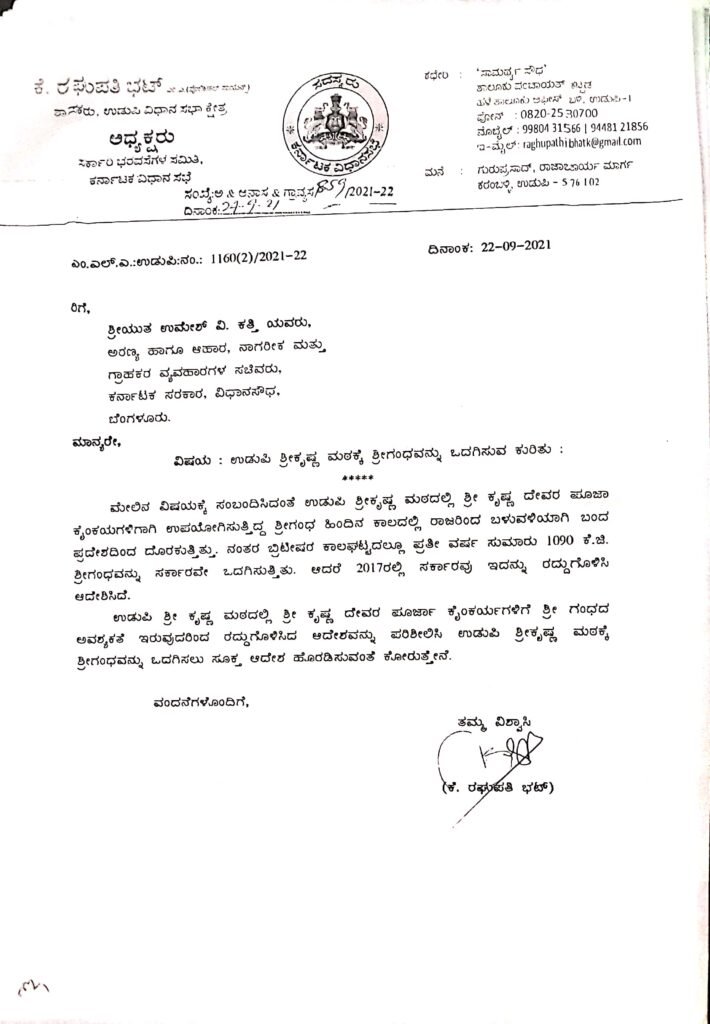 ಶ್ರೀ ಕೃಷ್ಣಮಠಕ್ಕೆ ಶ್ರೀಗಂಧ ಒದಗಿಸುವ ಸಂಬಂಧ ಉಡುಪಿ ಶಾಸಕ ಕೆ ರಘುಪತಿ ಭಟ್ ಅವರು ಸಚಿವ ಉಮೇಶ್ ಕತ್ತಿ ಅವರಿಗೆ 2021ರ ಸೆಪ್ಟಂಬರ್ 22ರಂದು ಪತ್ರ ಬರೆದಿದ್ದರು. ‘ಉಡುಪಿ ಶ್ರೀ ಕೃಷ್ಣಮಠದಲ್ಲಿ ಶ್ರೀ ಕೃಷ್ಣ ದೇವರ ಪೂಜಾ ಕೈಂಕರ್ಯಗಳಿಗಾಗಿ ಉಪಯೋಗಿಸುತ್ತಿದ್ದ ಶ್ರೀಗಂಧ ಹಿಂದಿನ ಕಾಲದಲ್ಲಿ ರಾಜರಿಂದ ಬಳುವಳಿಯಾಗಿ ಬಂದ ಪ್ರದೇಶದಿಂದ ದೊರಕುತ್ತಿತ್ತು. ನಂತರ ಬ್ರಿಟೀಷರ ಕಾಲಘಟ್ಟದಲ್ಲೂ ಪ್ರತಿ ವರ್ಷ 1090 ಕೆ ಜಿ. ಶ್ರೀಗಂಧವನ್ನು ಸರ್ಕಾರವೇ ಒದಗಿಸುತ್ತಿತ್ತು.