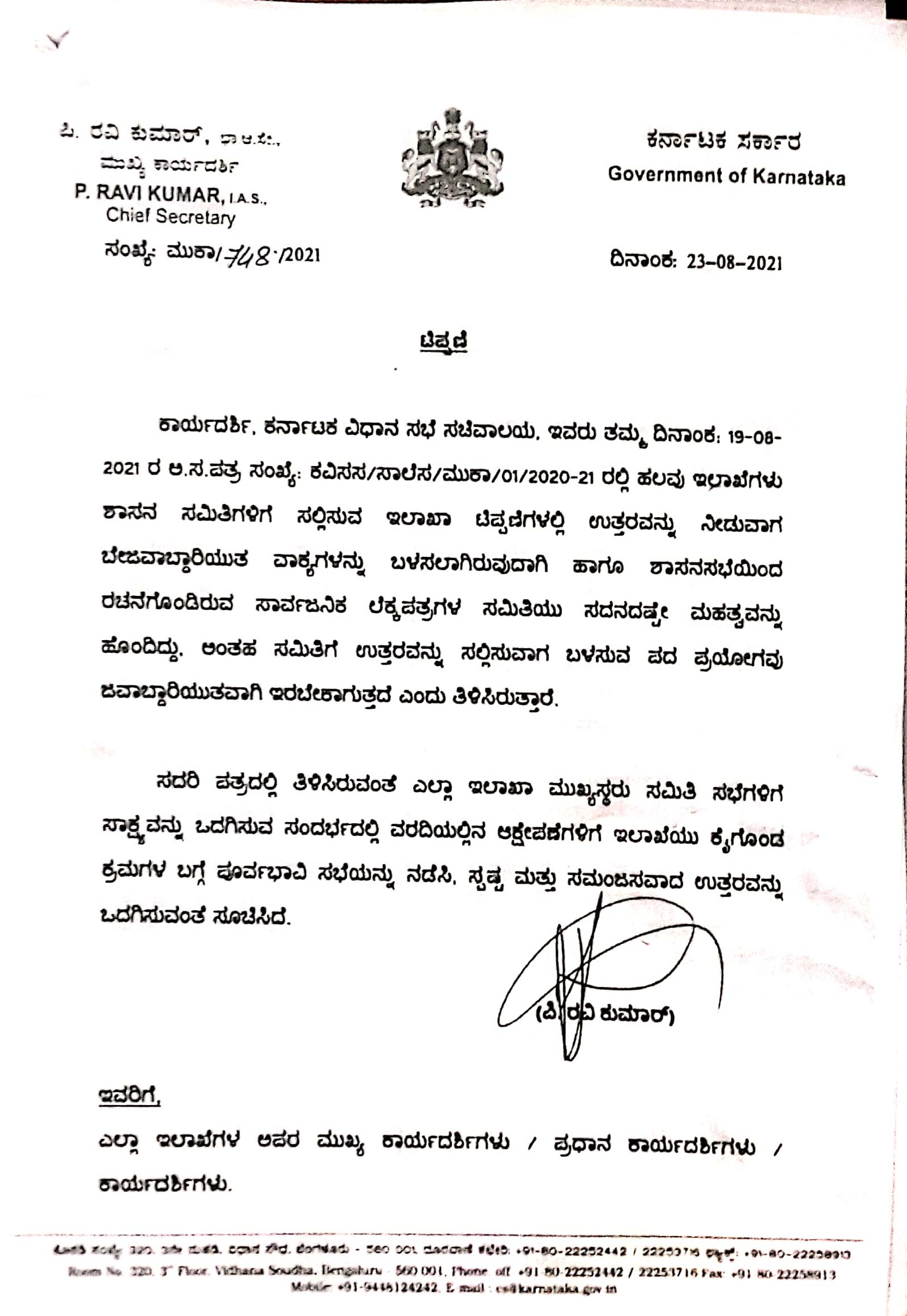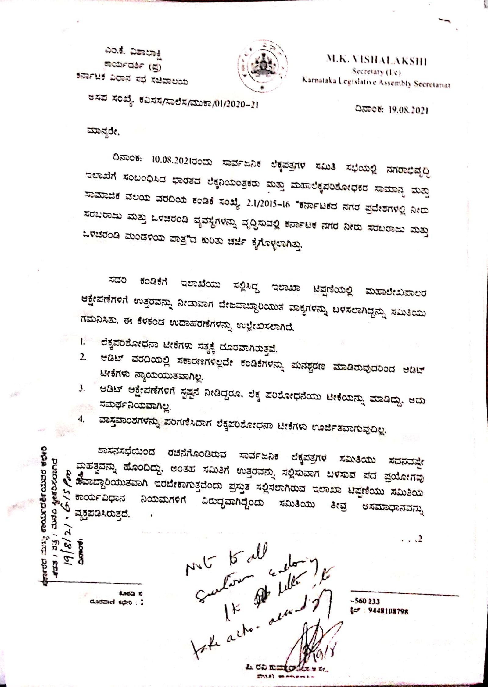 ಅಲ್ಲದೆ ಶಾಸನಸಭೆಯಿಂದ ರಚಿತಗೊಂಡಿರುವ ಸಾರ್ವಜನಿಕ ಲೆಕ್ಕಪತ್ರಗಳ ಸಮಿತಿಯ ಸದನದಷ್ಟೇ ಮಹತ್ವ ಹೊಂದಿದೆ. ಅಂತಹ ಸಮಿತಿಗೆ ಉತ್ತರವನ್ನು ಸಲ್ಲಿಸುವಾಗ ಬಳಸುವ ಪದ ಪ್ರಯೋಗವು ಜವಾಬ್ದಾರಿಯುತವಾಗಿಲ್ಲ. ಅಲ್ಲದೆ ಇಲಾಖೆ ಟಿಪ್ಪಣಿಯು ಸಮಿತಿಯ ಕಾರ್ಯವಿಧಾನ ನಿಯಮಗಳಿಗೆ ವಿರುದ್ಧವಾಗಿದೆ ಎಂದು ಸಮಿತಿಯೂ ಕೂಡ ತೀವ್ರ ಅಸಮಾಧಾನ ವ್ಯಕ್ತಪಡಿಸಿರುವುದು ಪತ್ರದಿಂದ ಗೊತ್ತಾಗಿದೆ.