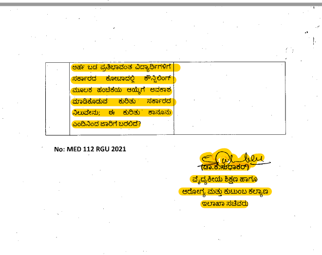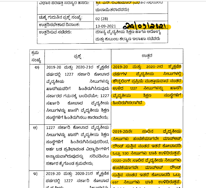 2091-20 ಮತ್ತು 2020-21ನೇ ಶೈಕ್ಷಣಿಕ ವರ್ಷದಲ್ಲಿ 1,227 ಸರ್ಕಾರಿ ಕೋಟಾದ ವೈದ್ಯಕೀಯ ಸೀಟುಗಳನ್ನು ಖಾಸಗಿಯವರಿಗೆ ಹಿಂತಿರುಗಿಸಿರುವುದು ಮತ್ತು 2021-22ರ ಶೈಕ್ಷಣಿಕ ವರ್ಷದಲ್ಲಿ ಶಿಕ್ಷಣ ಸಂಸ್ಥೆಗಳಿಂದ ಸರ್ಕಾರ ವಾಪಸ್ ಪಡೆದು ಅರ್ಹ ಬಡ ಪ್ರತಿಭಾವಂತ ವಿದ್ಯಾರ್ಥಿಗಳಿಗೆ ಸರ್ಕಾರದ ಕೋಟಾದಲ್ಲಿ ಕೌನ್ಸಲಿಂಗ್ ಮೂಲಕ ಹಂಚಿಕೆಯ ಆಯ್ಕೆ ಮಾಡಿಕೊಡುವ ಕುರಿತು ಕೇಳಿದ್ದ ಪ್ರಶ್ನೆಗೆ ಸಚಿವ ಸುಧಾಕರ್ ಅವರು ಯಾವುದೇ ಉತ್ತರವನ್ನೂ ನೀಡಿಲ್ಲ.