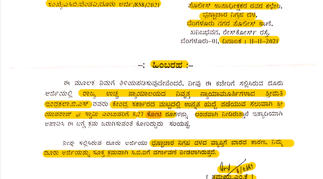 ‘ರಾಜ್ಯ ಉಚ್ಛ ನ್ಯಾಯಾಲಯದ ನಿವೃತ್ತ ನ್ಯಾಯಮೂರ್ತಿಗಳಾದ ಇಂದ್ರಕಲಾ ಬಿ ಎಸ್‌ ಅವರು ಕೇಂದ್ರ ಸರ್ಕಾರದ ಮಟ್ಟದಲ್ಲಿ ಉನ್ನತ ಹುದ್ದೆ ಪಡೆಯುವ ಸಲುವಾಗಿ ಯುವರಾಜ್‌ ಸ್ವಾಮಿ ಎಂಬುವರಿಗೆ 8.27 ಕೋಟಿ ರು.ಗಳನ್ನು ಲಂಚವಾಗಿ ನೀಡಿರುತ್ತಾರೆ ಎಂದು ಆಪಾಧಿಸಿ ಈ ಬಗ್ಗೆ ಕ್ರಮ ಜರುಗಿಸುವಂತೆ ಕೋರಿದ್ದು ಸರಿಯಷ್ಟೇ. ಈ ದೂರು ಅರ್ಜಿಯು ಭ್ರಷ್ಟಾಚಾರ ನಿಗ್ರಹ ದಳದ ವ್ಯಾಪ್ತಿಗೆ ಬಾರದ ಕಾರಣ ನಿಮ್ಮ ದೂರು ಅರ್ಜಿಯನ್ನು ಸೂಕ್ತ ಕ್ರಮವಾಗಿ ಸಿಬಿಐಗೆ ವರ್ಗಾವಣೆ ನೀಡಲಾಗಿರುತ್ತದೆ,’ ಎಂದು ಹಿಂಬರಹದಲ್ಲಿ ಹೇಳಲಾಗಿದೆ.