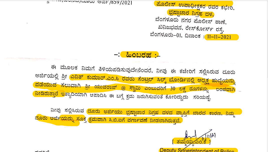 ಅದೇ ರೀತಿ ಎನಿತ್‌ ಕುಮಾರ್‌ ಎಂ ಸಿ ಅವರು ಸಹ ಸೆಂಟ್ರಲ್‌ ಸಿಲ್ಕ್‌ ಬೋರ್ಡ್‌ನಲ್ಲಿ ಅಧ್ಯಕ್ಷ ಹುದ್ದೆ ಪಡೆಯುವ ಸಲುವಾಗಿ ಯುವರಾಜ್‌ ಸ್ವಾಮಿಗೆ 30 ಲಕ್ಷ ರು.ಗಳನ್ನು ಲಂಚವಾಗಿ ನೀಡಿರುತ್ತಾರೆ ಎಂದು ಆಪಾದಿಸಿ ಸಲ್ಲಿಸಿದ್ದ ದೂರು ಅರ್ಜಿಯನ್ನೂ ಸಿಬಿಐಗೆ ವರ್ಗಾವಣೆ ಮಾಡಿರುವುದು ಹಿಂಬರಹದಿಂದ ತಿಳಿದು ಬಂದಿದೆ.