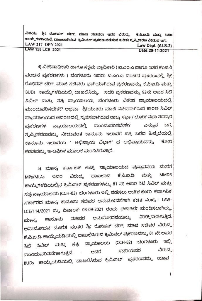 ಅದೇ ರೀತಿ ರೋಷನ್ ಬೇಗ್ ವಿರುದ್ಧ ಬಡ್ಸ್ ಕಾಯ್ದೆಯಡಿಯಲ್ಲಿ ದಾಖಲಿಸಿರುವ ಕ್ರಿಮಿನಲ್ ಪ್ರಕರಣವನ್ನು ಯಾವ ನ್ಯಾಯಾಲಯದಲ್ಲಿ ಮುಂದುವರೆಸಬೇಕು ಎನ್ನುವ ಬಗ್ಗೆ ಕರ್ನಾಟಕ ಉಚ್ಚ ನ್ಯಾಯಾಲಯದಿಂದ ಯಾವುದೇ ಪ್ರಸ್ತಾವನೆ ಕಾನೂನು ಇಲಾಖೆಗೆ ಬಂದಿಲ್ಲ. ಈ ಕುರಿತು ಕಾನೂನು ಇಲಾಖೆಯು 2021ರ ನವೆಂಬರ್ 29ರಂದು ನೀಡಿರುವ ಅಭಿಪ್ರಾಯದ ಟಿಪ್ಪಣಿ ಹಾಳೆಯು ‘ದಿ ಫೈಲ್’ಗೆ ಲಭ್ಯವಾಗಿದೆ.